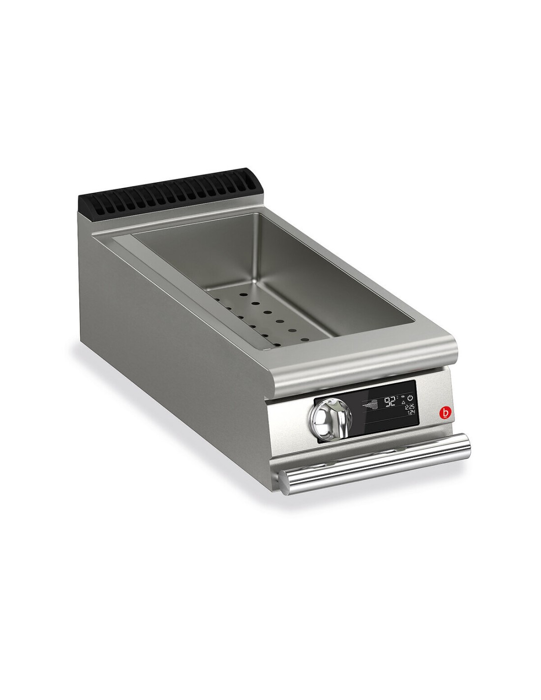 Einstellbare Temperatur im Tank mit Überlauf und perforiertem Zwischenboden zur Aufnahme von Behältern. Behälter in GN-Größe.