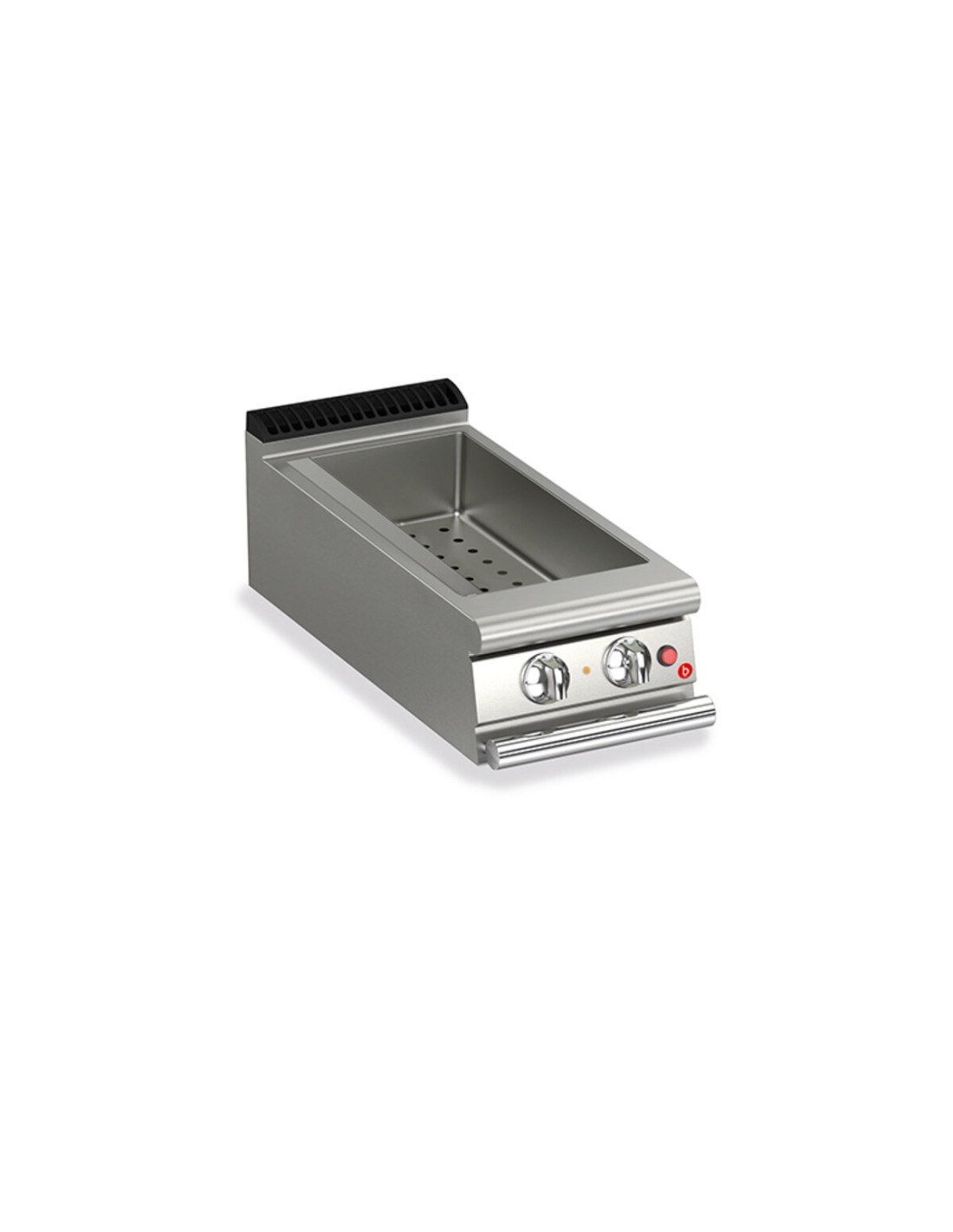 M80: 2xGN1/3 + 2xGN 1/1 TANK Einstellbare Temperatur im Tank mit Überlauf und perforiertem Zwischenboden zur Aufnahme von Behältern. Behälter in GN-Größe. Geräte, die nach der Niederspannungsrichtlinie 2014/35/EU gemäß dem internationalen CB-Schema zertifiziert sind. Dank der durch spezielle Tests erlangten Strahlwasserschutz-Zertifizierung (IPX5) können die Knöpfe und Unterknöpfe am Ende des Arbeitstages gewaschen werden, ohne die Funktionalität und Sicherheit zu beeinträchtigen. Die vordere Leiste ist ein bequemer Halt für den Koch; sie hält einen sicheren Abstand zur Arbeitsfläche und schützt so vor versehentlichen Zusammenstossen mit dem, was auf der Arbeitsfläche liegt, und gleichzeitig mit den Griffen.