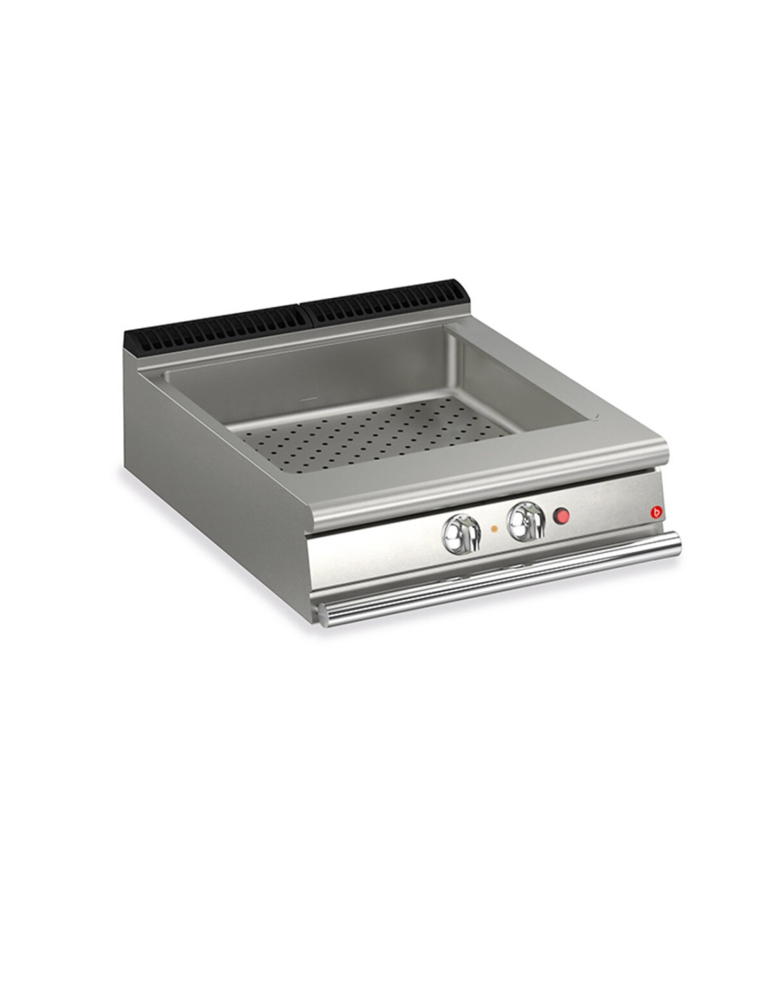 M80: 2xGN1/3 + 2xGN 1/1 TANK Einstellbare Temperatur im Tank mit Überlauf und perforiertem Zwischenboden zur Aufnahme von Behältern. Behälter in GN-Größe. Geräte, die nach der Niederspannungsrichtlinie 2014/35/EU gemäß dem internationalen CB-Schema zertifiziert sind. Dank der durch spezielle Tests erlangten Strahlwasserschutz-Zertifizierung (IPX5) können die Knöpfe und Unterknöpfe am Ende des Arbeitstages gewaschen werden, ohne die Funktionalität und Sicherheit zu beeinträchtigen. Die vordere Leiste ist ein bequemer Halt für den Koch; sie hält einen sicheren Abstand zur Arbeitsfläche und schützt so vor versehentlichen Zusammenstossen mit dem, was auf der Arbeitsfläche liegt, und gleichzeitig mit den Griffen.