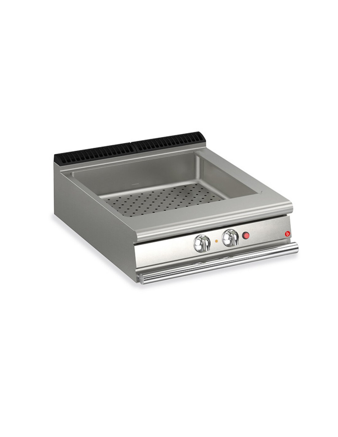 Bain-marie: GN-Behälter mit Überlauf, Temperaturregelung von 30° bis 90°C, Gas- und Elektrooptionen. Wasserdichtigkeit (IPX5), für die Niederspannungsrichtlinie 2014/35/EU zertifizierte Geräte nach dem internationalen CB-Schema, mit automatischer oder manueller Wasserbefüllung, für Effizienz und Sicherheit.Geeignet für das Halten von Speisen auf einer Temperatur unter 100° und für sehr empfindliches Garen. Modul 40: Badgröße 1xGN 1/1 Modul 80: Wannenabmessungen 2xGN 1/1 Beheizt durch gepanzerte Heizelemente, die außerhalb des Tanks. Thermostat steuern. Konfigurationsbeispiele M40: 1xGN1/3 + 1xGN 1/1 VASCA M80: 2xGN1/3 + 2xGN 1/1 VASCA Einstellbare Temperatur im Tank mit Überlauf und perforiertem Zwischenboden zur Aufnahme von Behältern. Behälter in GN-Größe. Geräte, die nach der Niederspannungsrichtlinie 2014/35/EU gemäß dem internationalen CB-Schema zertifiziert sind. Dank der durch spezielle Tests erlangten Strahlwasserschutz-Zertifizierung konnen die Knöpfe und Unterknöpfe am Ende des Arbeitstages gewaschen werden, ohne dass die Funktionalität und Sicherheit beeinträchtigt wird. Die vordere Leiste ist ein bequemer Halt für den Koch; sie hält einen sicheren Abstand zur Arbeitsfläche und schützt so vor versehentlichen Zusammenstossen mit dem, was auf der Arbeitsfläche liegt, und gleichzeitig mit den Griffen.