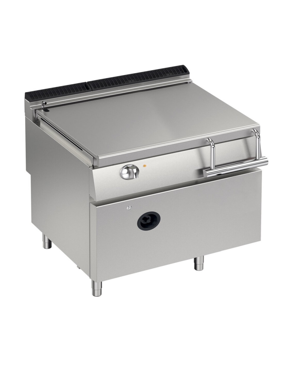 Kipptank mit großem Radius. Temperaturregelung zwischen 100°C und 280°C über Thermostat. Geräte, die nach der Niederspannungsrichtlinie 2014/35/EU gemäß dem internationalen CB-Schema zertifiziert sind. Dank der durch spezielle Tests erlangten Strahlwasserschutz-Zertifizierung (IPX5) können die Knöpfe und Unterknöpfe am Ende des Arbeitstages gewaschen werden, ohne die Funktionalität und Sicherheit zu beeinträchtigen. Die vordere Leiste ist ein bequemer Halt für den Koch; sie hält einen sicheren Abstand zur Arbeitsfläche und schützt so vor versehentlichen Zusammenstossen mit dem, was auf der Arbeitsfläche liegt, und gleichzeitig mit den Griffen.