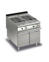Professionelle Gasfriteusen. Tanks aus rostfreiem Stahl AISI 18/10 mit Kaltzone und Schaumausdehnungszone. Ölablasshähne. Sicherheitsthermostat (230°C) gegen zu hohe Öltemperatur Gasversion: Beheizung durch Edelstahlbrenner außerhalb des Tanks (1-Tank-Modell auch mit Brenner im Tank erhältlich). Öltemperaturregelung durch mechanischen Thermostat mit Einstellung von 100 bis 185°CAußenschalen und Füße aus Edelstahl. Arbeitstisch höhenverstellbar von 840 bis 900 mm. Platten mit 2 mm Dicke. Tanks aus rostfreiem Stahl AISI 18/10 mit Kaltzone und Schaumausdehnungszone. Ölablasshähne. Ölauffangwannen auf Anfrage. Sicherheitsthermostat (230°C) gegen zu hohe Öltemperaturen Gas-Version: Beheizung über Edelstahlbrenner außerhalb des Tanks (1-Tank-Modell mit Brenner im Tank ebenfalls erhältlich). Öltemperaturregelung durch mechanischen Thermostat mit Einstellung von 100 bis 185°C. Elektrische Version: Die Beheizung erfolgt über ein gepanzertes Heizelement aus Edelstahl AISI 304, das sich im Inneren des Tanks befindet und in der 22-l-Tankversion um mehr als 90° drehbar ist. Vollständig abnehmbares Heizelement in den Tankversionen 10 und 15 Liter. Die Tanks haben eine große Ausgießfläche und eine kalte Zone am Boden, um Lebensmittelpartikel aufzufangen und die Lebensdauer des Öls zu verlängern. Inklusive Schmutzfangkonvektor. Dieses Element erleichtert die Ablagerung von Schmutz in der kalten Zone und verhindert, dass sich der Schmutz in den heißen Zonen des Tanks ablagert. Der Lebenszyklus des Öls wird dadurch verlängert. Dank der durch spezielle Tests erlangten Strahlwasserschutz-Zertifizierung (IPX5) können die Knöpfe und Unterknöpfe am Ende des Arbeitstages gewaschen werden, ohne die Funktionalität und Sicherheit zu beeinträchtigen. Die vordere Leiste ist ein bequemer Halt für den Koch; sie hält einen sicheren Abstand zur Arbeitsfläche und schützt so vor versehentlichen Zusammenstossen mit dem, was auf der Arbeitsfläche liegt, und gleichzeitig mit den Griffen.