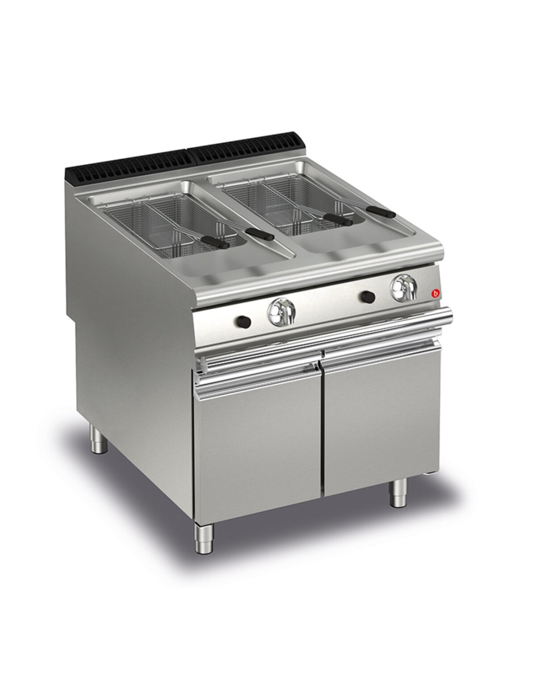 Professionelle Gasfriteusen. Tanks aus rostfreiem Stahl AISI 18/10 mit Kaltzone und Schaumausdehnungszone. Ölablasshähne. Sicherheitsthermostat (230°C) gegen zu hohe Öltemperatur Gasversion: Beheizung durch Edelstahlbrenner außerhalb des Tanks (1-Tank-Modell auch mit Brenner im Tank erhältlich). Öltemperaturregelung durch mechanischen Thermostat mit Einstellung von 100 bis 185°C