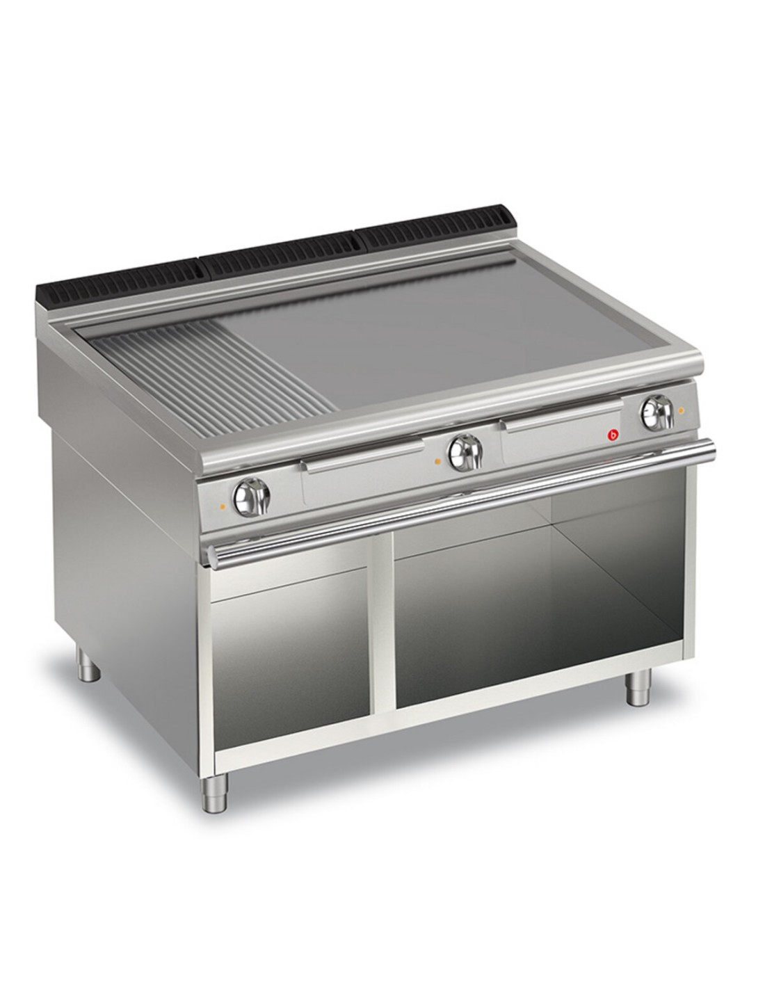 Mit dem Kochfeld verschweißte Platte, die eine größere Kochzone bietet und Schmutzansammlungen verhindert. Prädisposition für Kernfühler, für eine noch bessere Kochkontrolle. Das Erreichen der eingestellten Kerntemperatur wird durch ein akustisches Signal signalisiert Weiches Stahlblech (für Nicht-EU-Märkte). Geräte, die nach der Niederspannungsrichtlinie 2014/35/EU gemäß dem internationalen CB-Schema zertifiziert sind. Dank der durch spezielle Tests erlangten Strahlwasserschutz-Zertifizierung (IPX5) können die Knöpfe und Unterknöpfe am Ende des Arbeitstages gewaschen werden, ohne die Funktionalität und Sicherheit zu beeinträchtigen. Die vordere Leiste ist ein bequemer Halt für den Koch; sie hält einen sicheren Abstand zur Arbeitsfläche und schützt so vor versehentlichen Zusammenstossen mit dem, was auf der Arbeitsfläche liegt, und gleichzeitig mit den Griffen.