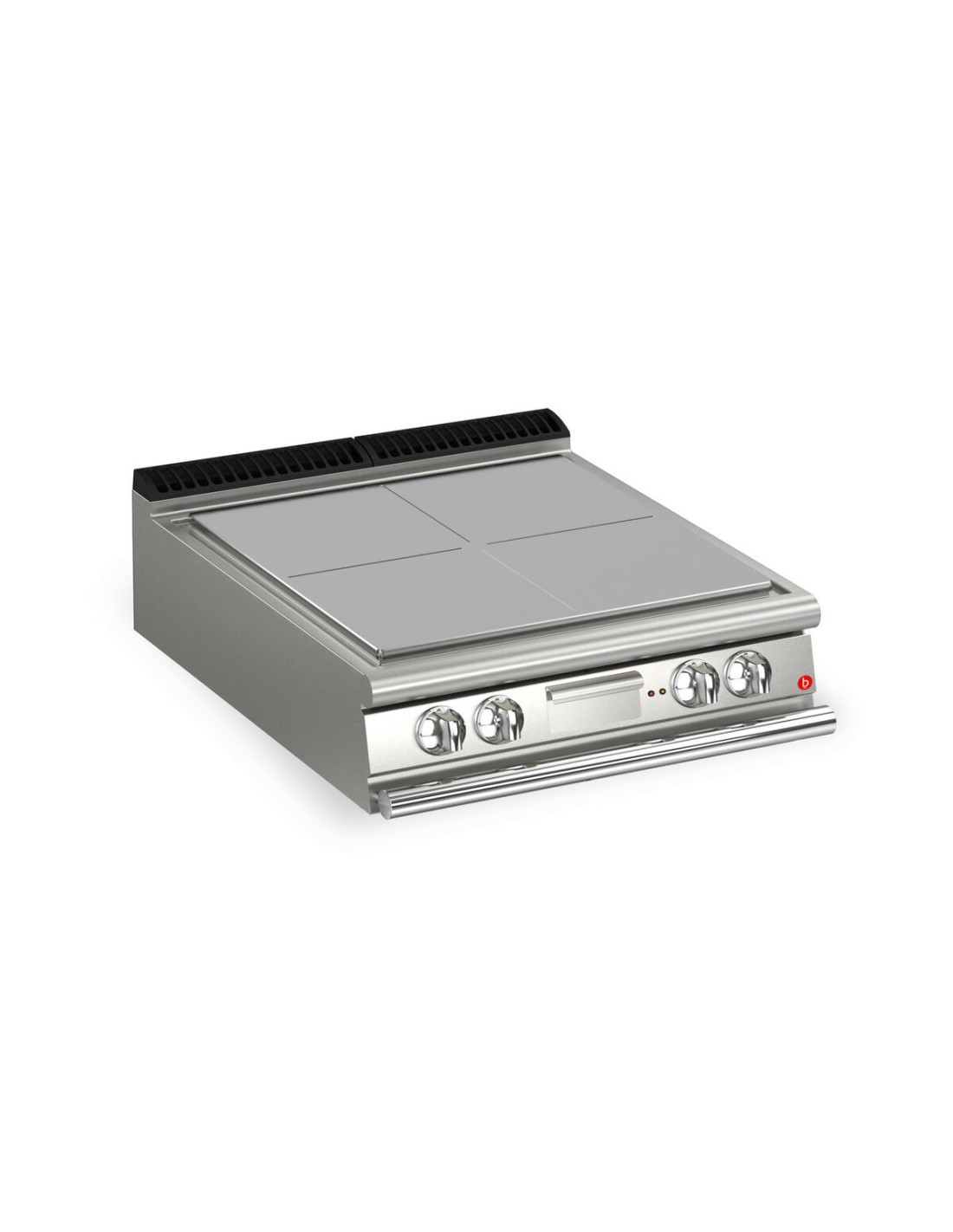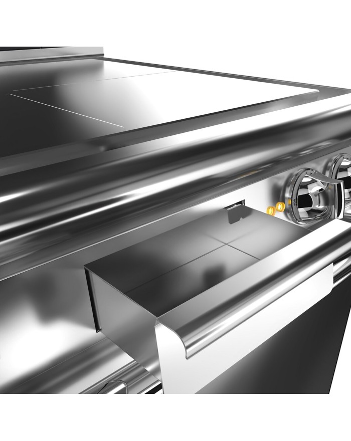 4 unabhängige Kochzonen mit je 4 kW. Umfangsrinne für die Fettsammlung mit Fettablauföffnung im Becken. Die Chrom-Molybdän-Platte mit direkten und indirekten Kochmöglichkeiten. Dank der durch spezielle Tests erlangten Strahlwasserschutz-Zertifizierung (IPX5) können die Knöpfe und Unterknöpfe am Ende des Arbeitstages gewaschen werden, ohne die Funktionalität und Sicherheit zu beeinträchtigen. Die vordere Leiste ist ein bequemer Halt für den Koch; sie hält einen sicheren Abstand zur Arbeitsfläche und schützt so vor versehentlichen Zusammenstossen mit dem, was auf der Arbeitsfläche liegt, und gleichzeitig mit den Griffen.