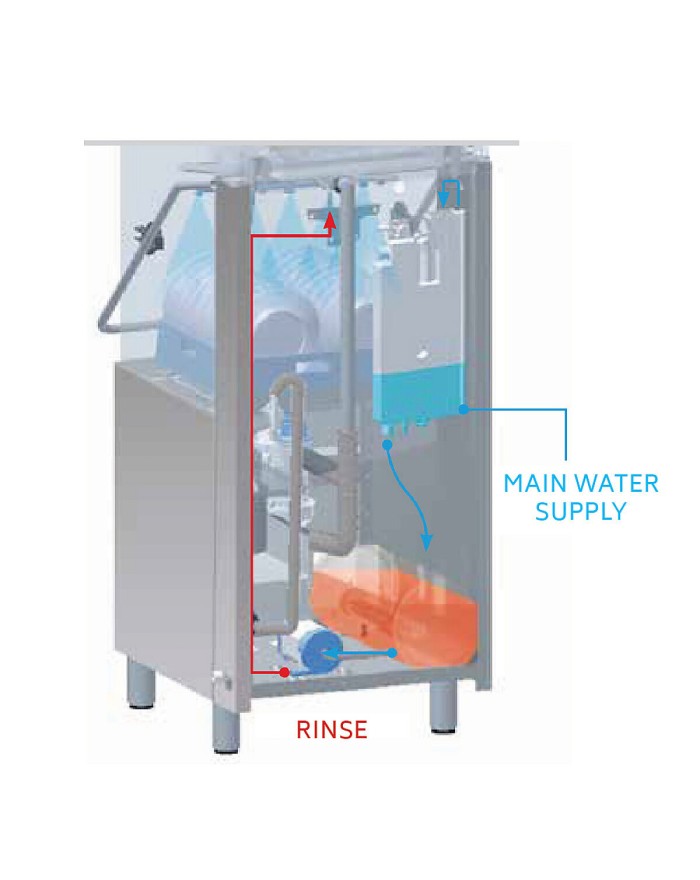 Stabilisierte Druckspülung und konstante Kesselwassertemperatur von 85°C. Dank des atmosphärischen Boilers wird eine Vermischung des Leitungswassers in der Nachspülphase vermieden. Das PLUS-System gewährleistet außerdem eine bessere Kontrolle und die richtige Dosierung des Klarspülers bei jedem Zyklus.