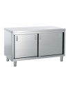 EDELSTAHL-ARBEITSPLATTE 18/10 AISI 304 SB Höhe 40 mm, Verstärkt mit laminiertem Holzpaneel, Aufkantung 100x15 mm EDELSTAHLGEHÄUSE 18/10 AISI 304 Zurück bündig zur Tischplatte 20 mm vorwärts EDELSTAHLEINLEGEBODEN 18/10 AISI 304 Längsverstärkung in der Mitte des höhenverstellbaren Regals an Zahnstangen TÜREN AUS EDELSTAHL 18/10 AISI 304 Front mit Griffmulde und innerer Gegentür VERSCHIEBBAR Obere Gleitschiene mit Lagern, untere Gleitschiene mit PVC-Gleitlager auf zweikanaligen PVC-Schienen TÜRFLÜGEN Schließen mit Magneten und Drehöffnung FÜSSE Runder Fuß aus Edelstahl 18/10 AISI 304, mit Nivellierer Scotch-Brite-Edelstahl-Ausführung. Arbeitsplatte. Wasserabweisend und schallabsorbierend schallschluckend. Schallgedämpfte Schiebetüren und höhenverstellbarer Zwischenboden. Verstellbare runde Füße. Kann mit Rollen ausgestattet werden.