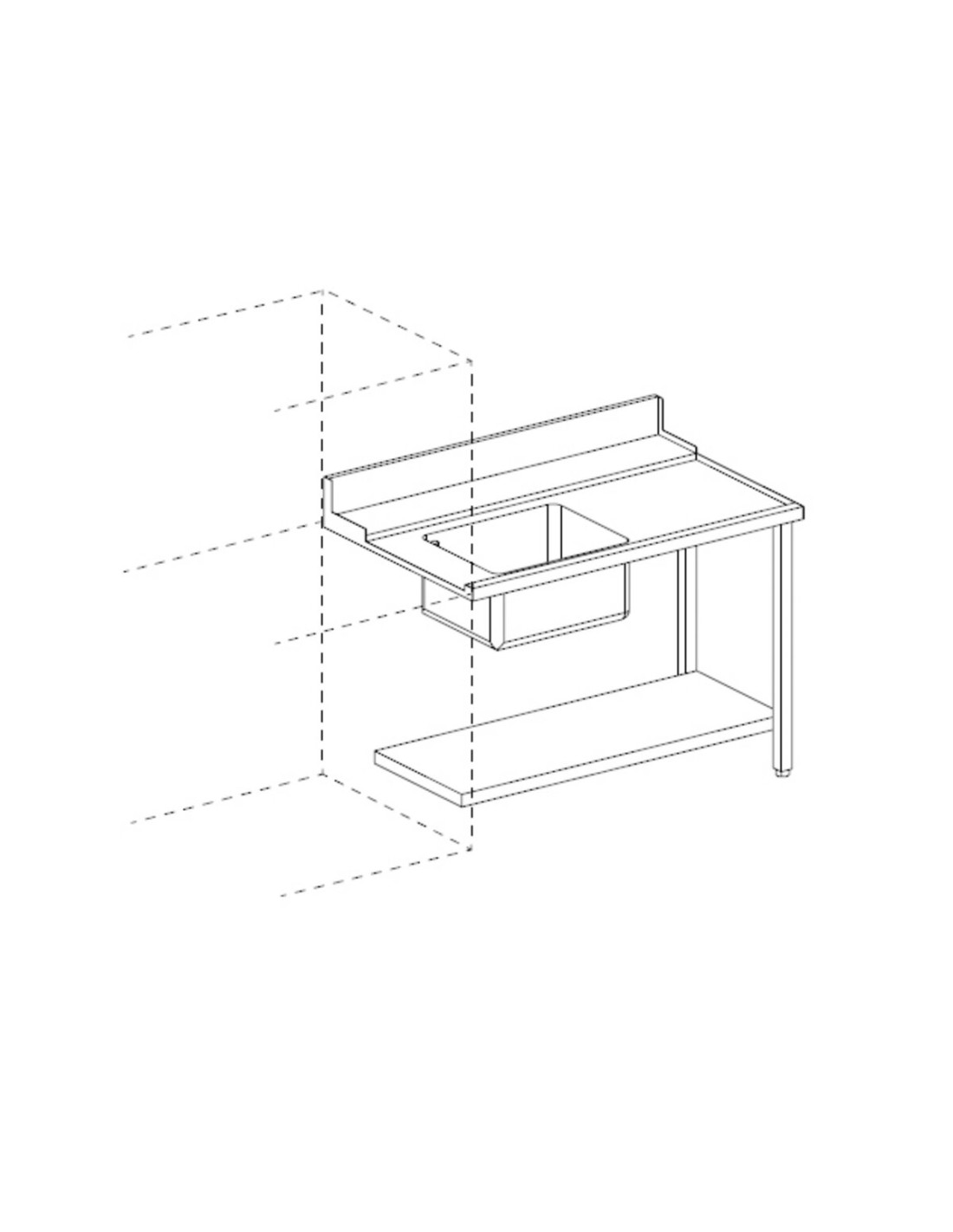 Vorspültisch zum Einbau rechts neben dem Geschirrspüler, mit unterer Ablage, Wanne (50x40x30 cm), Überlauf und Ablauf, komplett aus Edelstahl Aisi 304.
