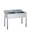 EDELSTAHLARBEITSPLATTE 18/10 AISI 304 SB Höhe 40 mm Aufkantung 100x15 mm Eingelassen mit geprägter Abtropffläche, Becken am Tisch geschweißt, mit Ablaufloch, Sieb, und Überlauf RAHMEN Rohr 40x40 aus gebürstetem Edelstahl 18/10 AISI 304 mit den Abmessungen 20 mm an den 4 Seiten der Platte, FÜSSE Quadrat mit Nivellierer, verstellbar mit 30 mm Federweg Scotch-Brite-Ausführung aus rostfreiem Stahl. Geformte Arbeitsplatte. Hinterer Tragegurt h 100 mm. Schallgedämpfter Tank. Verkleidung an drei Seiten mit handfesten Falten. Beine aus Vierkantrohr 40x40 mm mit verstellbaren Füßen. Wird mit Abfluss und Überlaufrohr geliefert. Kann mit falschen boden, untere Einlegeböden und Rahmen an drei Seiten.