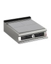Temperature control of heating elements by thermostat, operated by means of ergonomic recessed and inclined knobs.