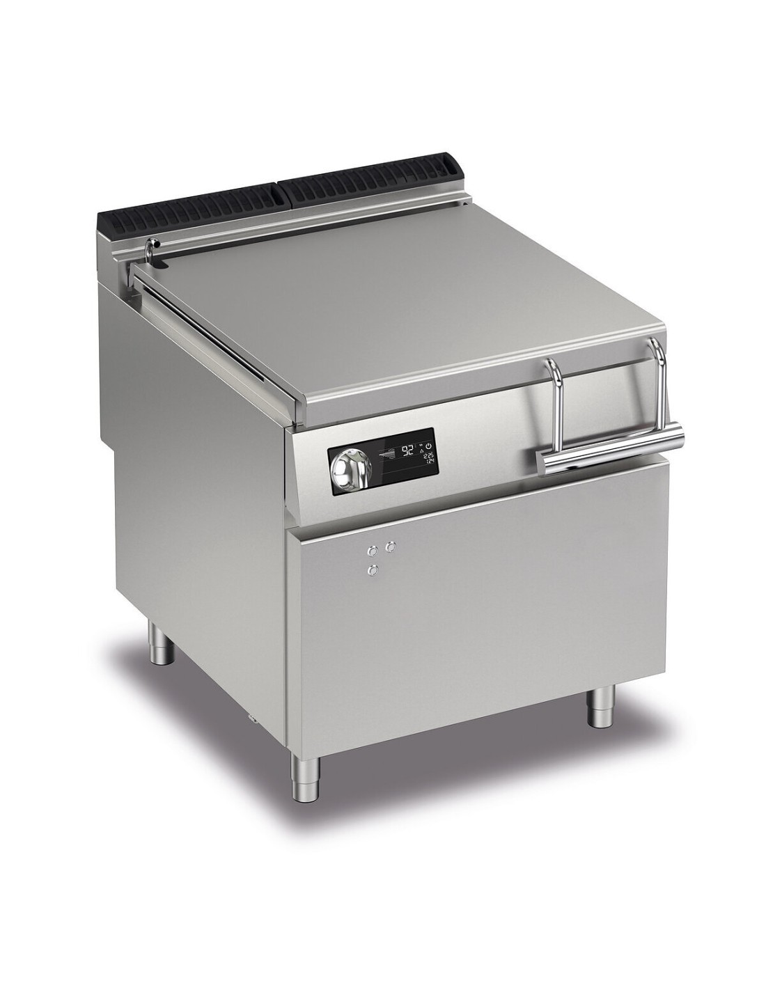 Large-radius tilting tank. Equipment certified for low voltage directive 2014/35/EU according to the international CB scheme. Thanks to the jet-proofing certification (IPX5) obtained through specific tests, knobs and under-knobs can be washed at the end of the working day without compromising functionality and safety. The front bar is a comfortable foothold for the cook; it keeps a safe distance from the worktop and thus protects against accidental collisions with what is resting on the worktops and at the same time the handles.