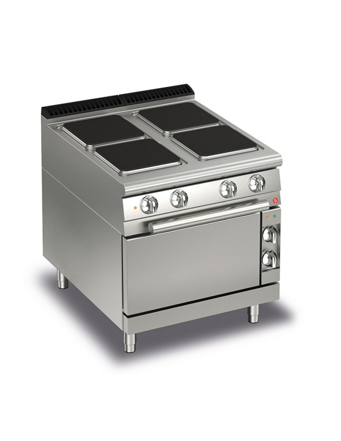 Electric Ranges: 300x300 mm cast iron plates, maximum power of 4 kW, safety thermostat and 7-position selector, water jet protection (IPX5). Certified equipment compliant with Low Voltage Directive 2014/35/EU under the international CB scheme.All-molded hob made from a single sheet of thick stainless steel.
