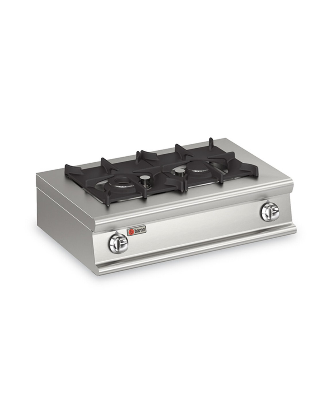 Stainless steel outer coatings and Scotch Brite finish. Tops with a thickness of 2 mm. Contoured dashboards with controls angled toward the operator. Burners of 3.5, 5.7 , 7 and 10 kW with stabilized flame, made of cast iron. Taps equipped with safety thermocouple with pilot flame. Black acid-resistant enamelled cast iron grids with long spokes for holding small pans. Steel drip pans (optional).