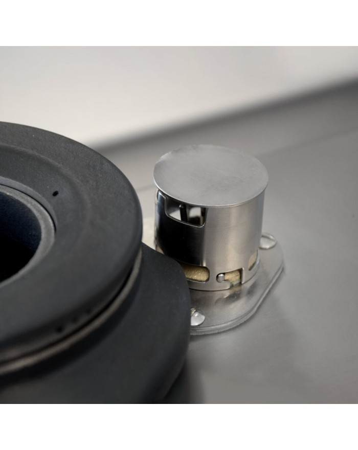 Enamelled cast-iron grills with long spokes for easy movement of pans between fires. High power cast iron burners 3.5- 5.7- 7 and 10 kW. Protected pilot flame with removable and easily washable protection. Thanks to the jet-proofing certification (IPX5) obtained through specific tests, knobs and under-knobs can be washed at the end of the working day without compromising functionality and safety. The front bar is a comfortable foothold for the cook; it keeps a safe distance from the worktop and thus protects against accidental collisions with what is resting on the worktops and at the same time the handles.