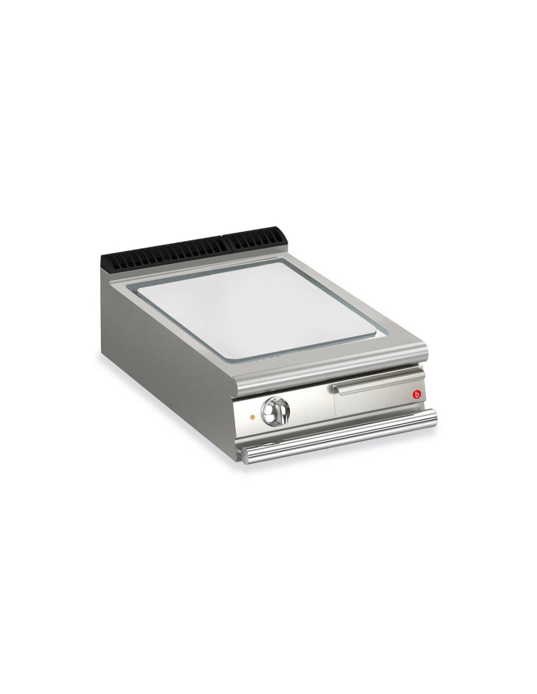 Fry Top: 15mm thick cooking plate, fully independent from the surface. It features a wide, drainable channel around the entire perimeter of the plate to collect cooking residues, sloped towards the front for liquid drainage into a large grease collection drawer. The plate is not welded, allowing for quicker maintenance and potential replacements on-site. It ensures thermal uniformity, with a thermal cut that benefits both the user and adjacent machinery, reducing energy consumption by 15% compared to traditional models.Stainless steel outer shells and feet.