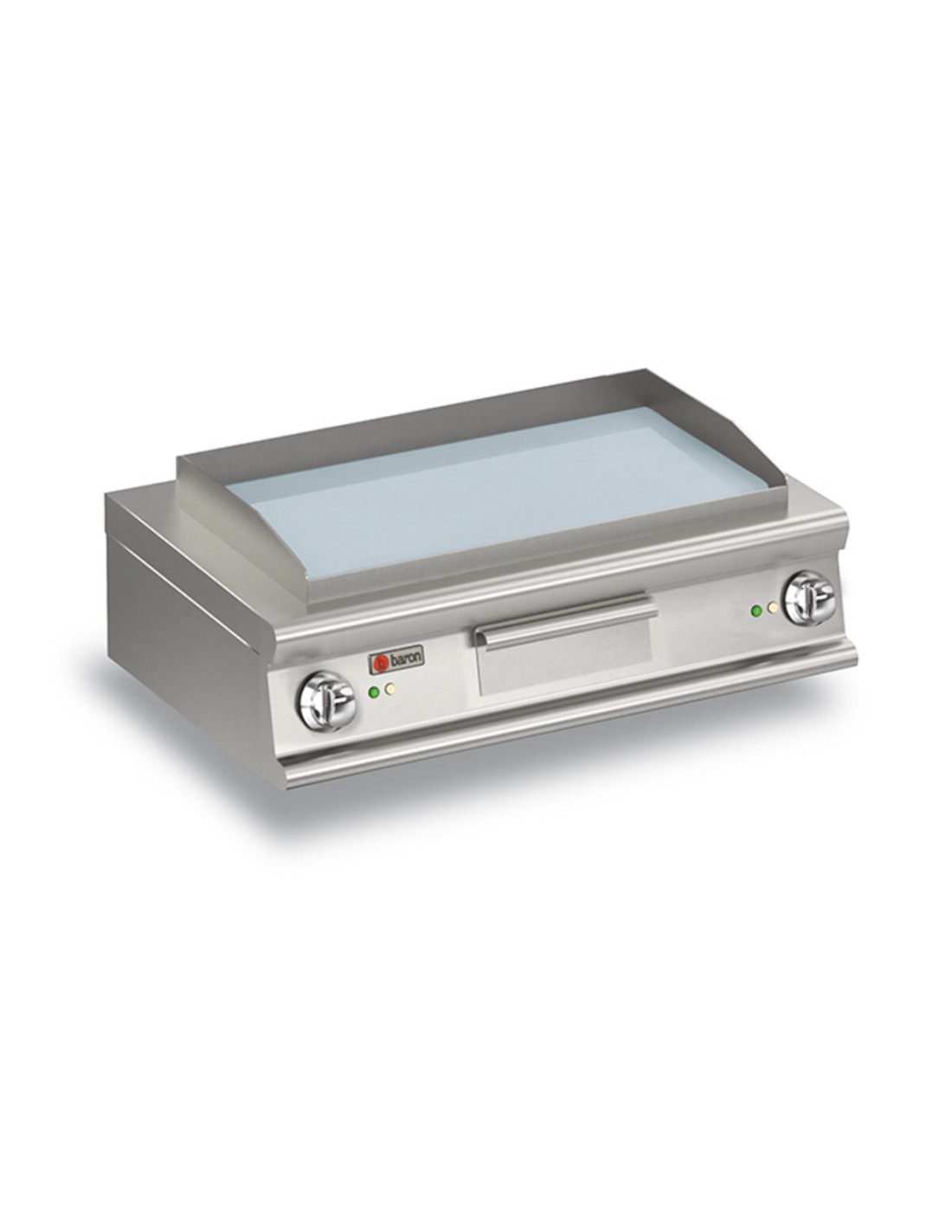 Stainless steel outer coatings and Scotch Brite finish. Tops with a thickness of 2 mm. Contoured dashboards with controls angled toward the operator. Cooking plate made of soft iron (normal plate), coated with polished hard chrome (chrome plate). Large fat collection drawer. Heating by means of armoured incoloy heating elements. Thermostatically controlled and adjustable baking temperature from 50 to 300°C. Safety thermostat.