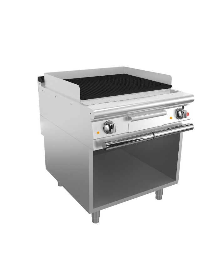 Professional Electric Grills: Device for adjusting the height of the grills on two levels. Channel with a drain hole and a removable grease and residue collection drawer. Internal drawer for residue collection. 4 types of grills available: stainless steel for meat, fish, mixed, and a reversible cast iron version for meat/fish. GRILL ACCESSORIES, HUMIDIFIER, SMOKER.Stainless steel outer shells and feet. Height of the work surface adjustable from 840 to 900 mm. Tops with a thickness of 2 mm. Aisi 304 steel burner controlled by safety valve and thermocouple. Piezo ignition. Adjustable temperature up to 350°C. Device for adjusting the height of the grids on two levels. Perimeter splash guard risers (h max=12mm). Canal with drainage hole and removable grease and residue collection. Internal drawer for collecting residual carbonaceous. Larger, recessed grease trough on the worktop, easier to clean and more capacious HUMIDIFIER accessory for optimal management of several types of cooking. Grill height adjustment for handling different types of cooking 4 Grill types available: meat, fish, mixed stainless steel and reversible cast iron meat/fish version Electric version with tilting heating elements to facilitate the cleaning process