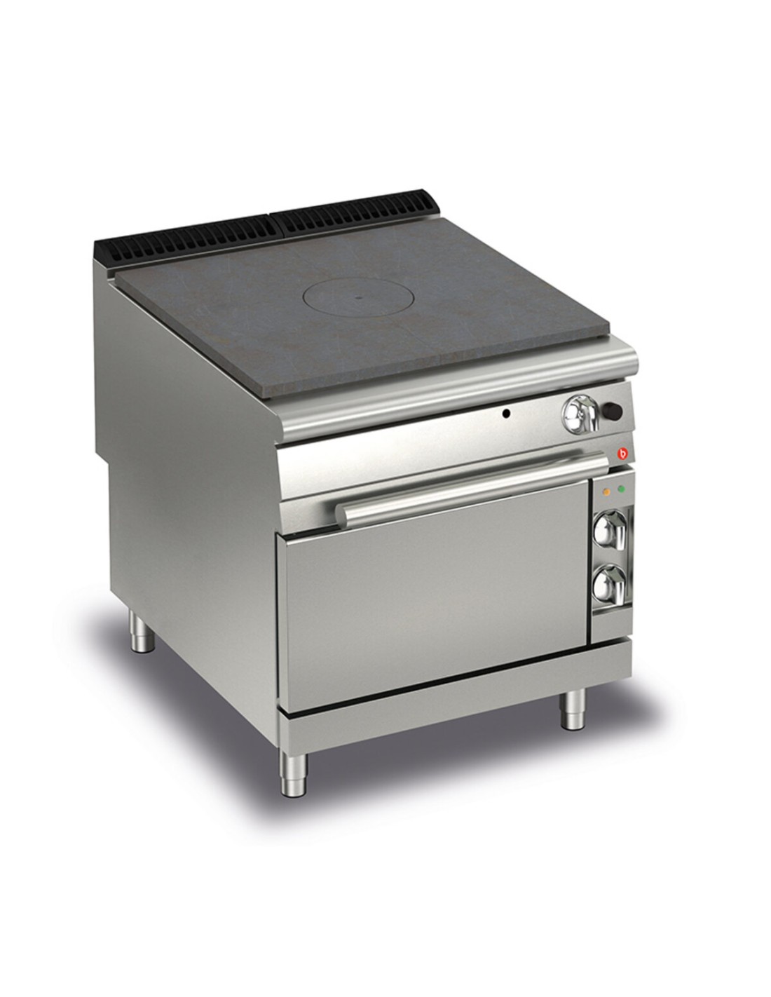 Gas Full Plate: Cast iron plate with temperature adjustment from 50° to 450°C, safe piezoelectric ignition. A single high-efficiency central burner creates differentiated thermal zones on the surface, with maximum heat concentration at the center and decreasing temperatures at the peripheral zones. Polished cast iron plate with a removable central disc.Polished cast iron plate with removable central disk.