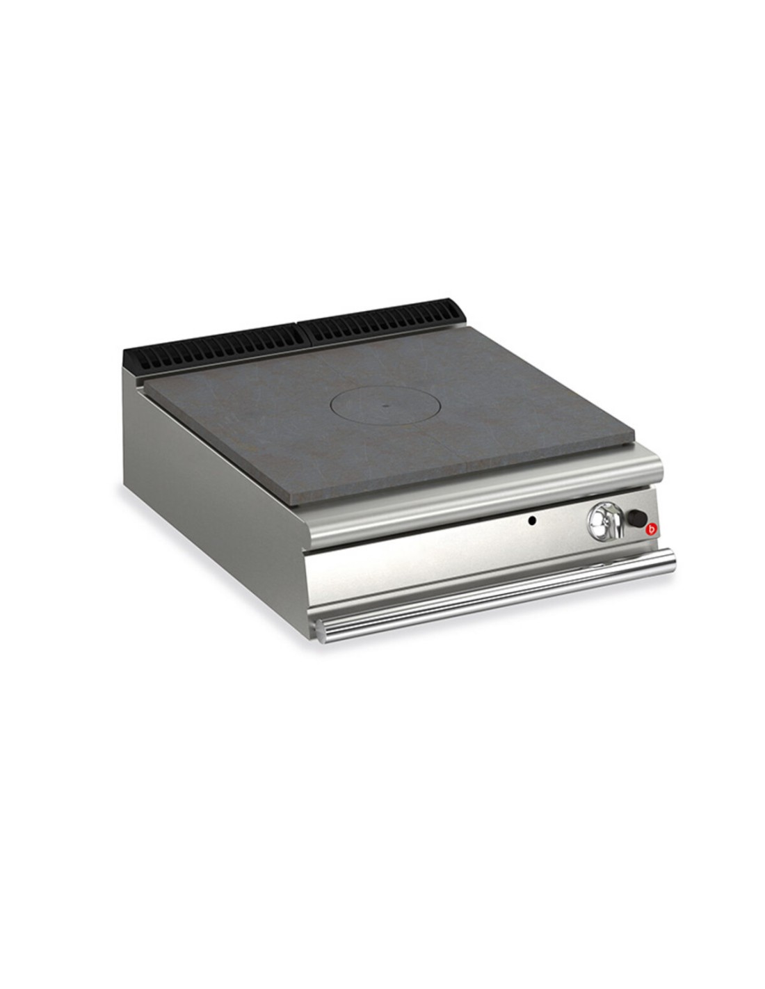 Gas Full Plate: Cast iron plate with temperature adjustment from 50° to 450°C, safe piezoelectric ignition. A single high-efficiency central burner creates differentiated thermal zones on the surface, with maximum heat concentration at the center and decreasing temperatures at the peripheral zones. Polished cast iron plate with a removable central disc.Polished cast iron plate with removable central disk.