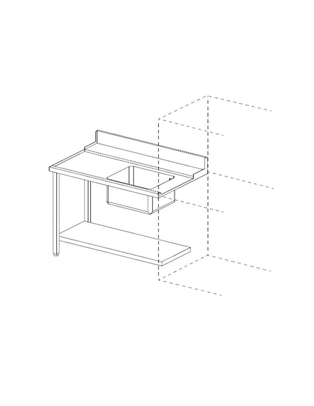Prewash table to be mounted to the left of the dishwasher, with lower shelf, tank (50x40x30 cm), overflow and drain, made entirely of Aisi 304 stainless steel.