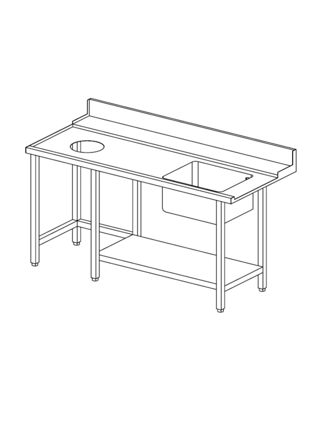Scraping-pre-washing table to be mounted to the left of the dishwasher, with bottom shelf, tank (50x40x30 cm), overflow and drain, tank and rubber ring for drain hole, made entirely of Aisi 304 stainless steel.