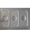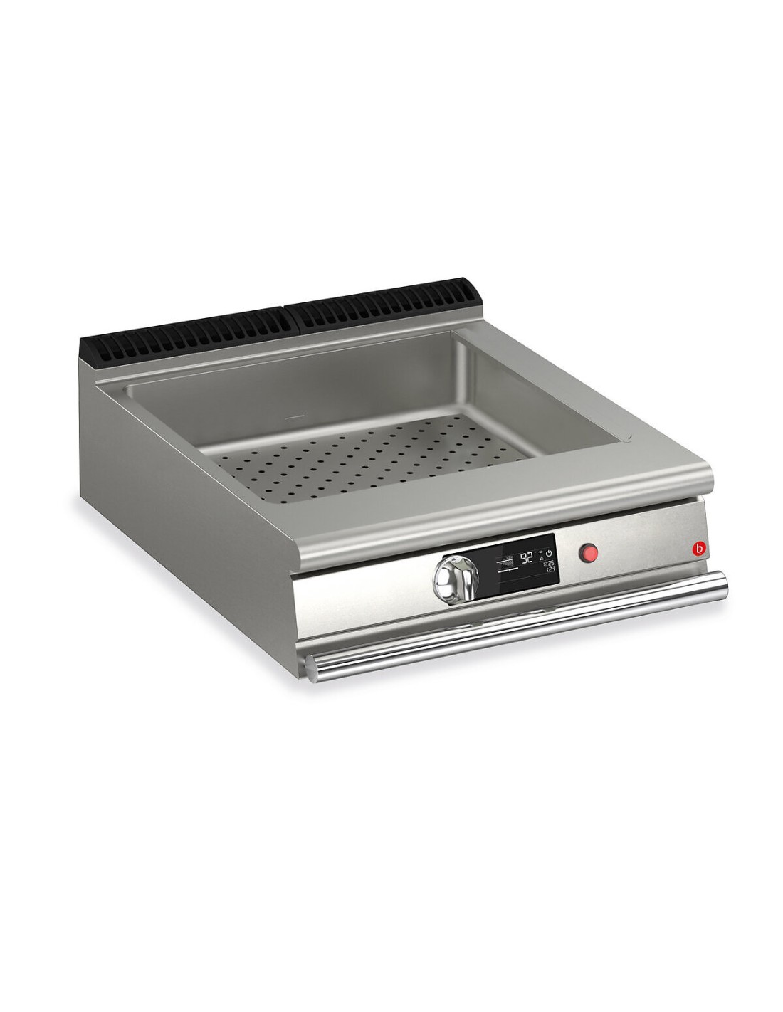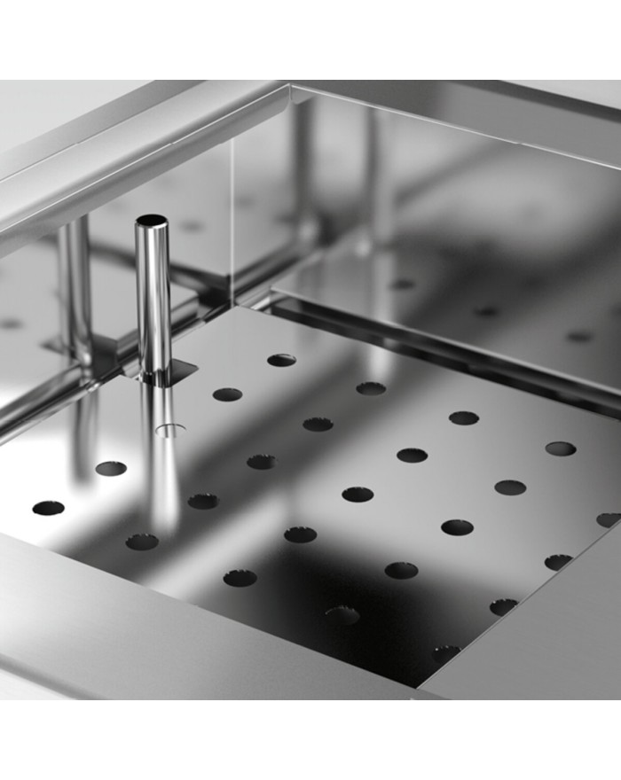 Temperatura regulable en cuba con rebosadero y falso fondo perforado para apoyo de recipientes. Depósito de tamaño GN.