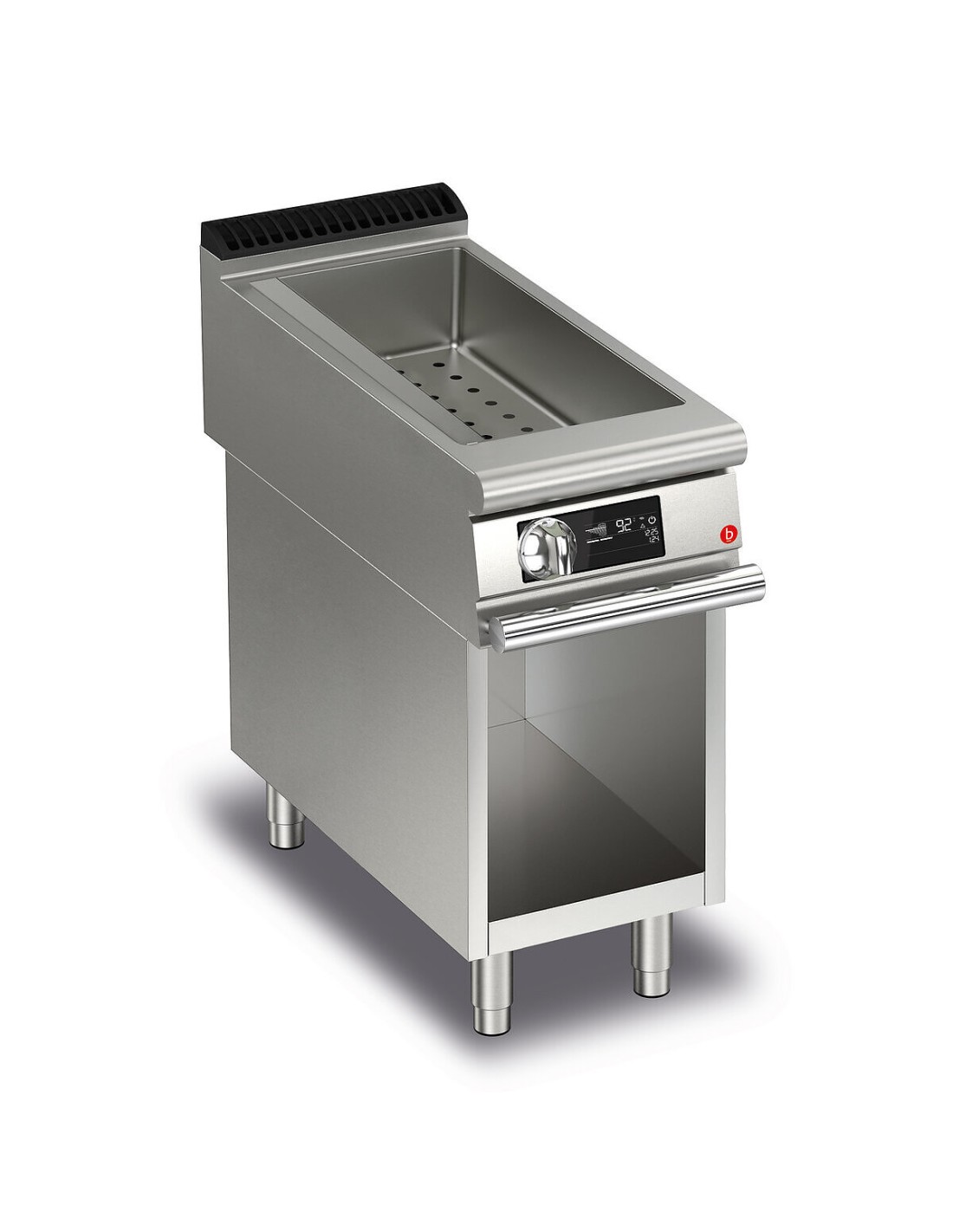 Temperatura regulable en cuba con rebosadero y falso fondo perforado para apoyo de recipientes. Depósito de tamaño GN.