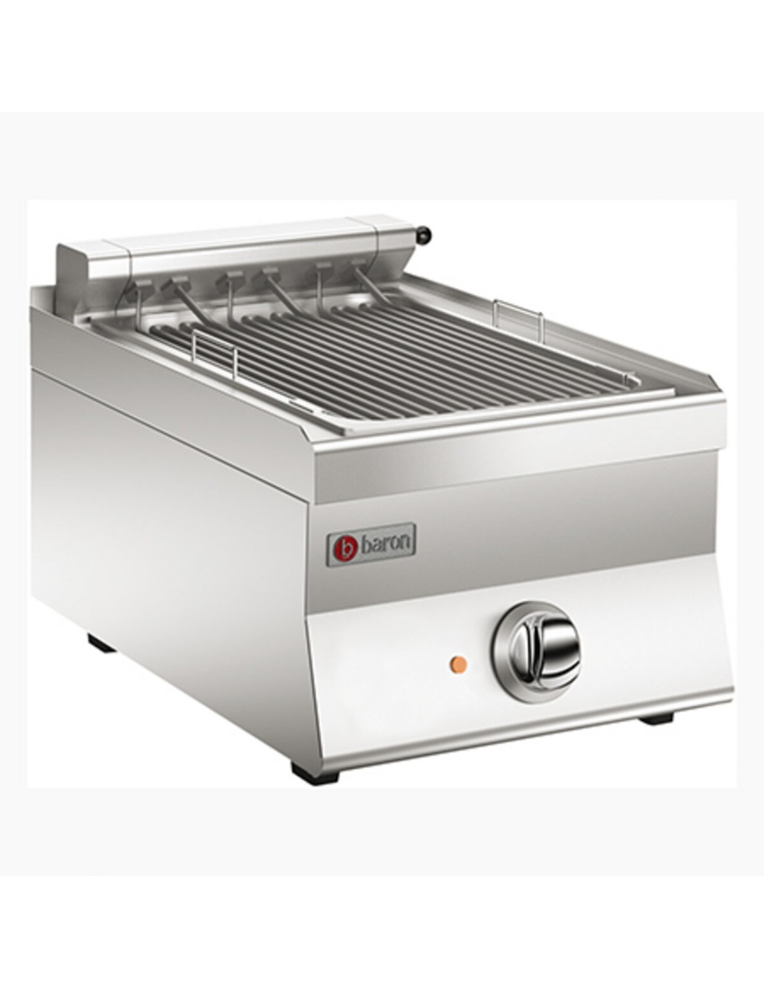 El grill Contact está equipado con una resistencia ovalada AISI 304 para la cocción directa. Lavabo GN 1/1 para el modelo 400 y GN 2/1 para el modelo 800 con función de humidificador y recogida de grasa extraíble para su limpieza. Temperatura controlada por regulador de energía. El conjunto del elemento calefactor está montado sobre un soporte basculante y se mantiene en la posición de trabajo o de limpieza mediante un pasador de bloqueo. La limpieza de la superficie de cocción se realiza por pirólisis con ayuda de un rastrillo convenientemente conformado a la geometría de los elementos calefactores. El conjunto del elemento calefactor está montado sobre un soporte basculante y se mantiene en la posición de trabajo o de limpieza mediante un pasador de bloqueo.