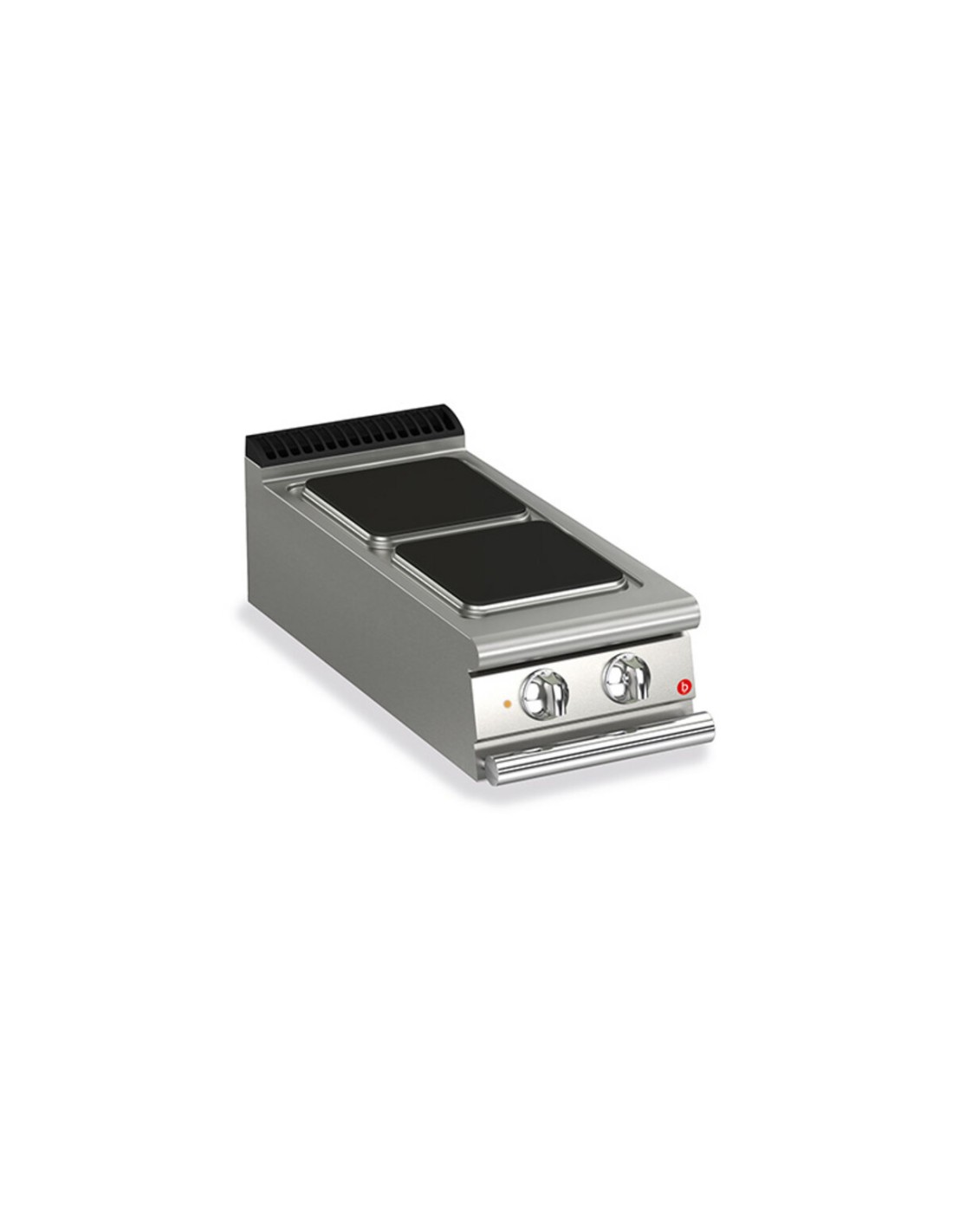 Cocinas eléctricas: placas de fundición de 300x300 mm, potencia máxima 4 kW, termostato de seguridad y selector de 7 posiciones, impermeable a chorros de agua (IPX5), Equipo certificado para directiva de baja tensión 2014/35/UE según esquema CB internacional.Placa totalmente prensada y mecanizada a partir de una sola lámina de acero inoxidable de gran espesor.