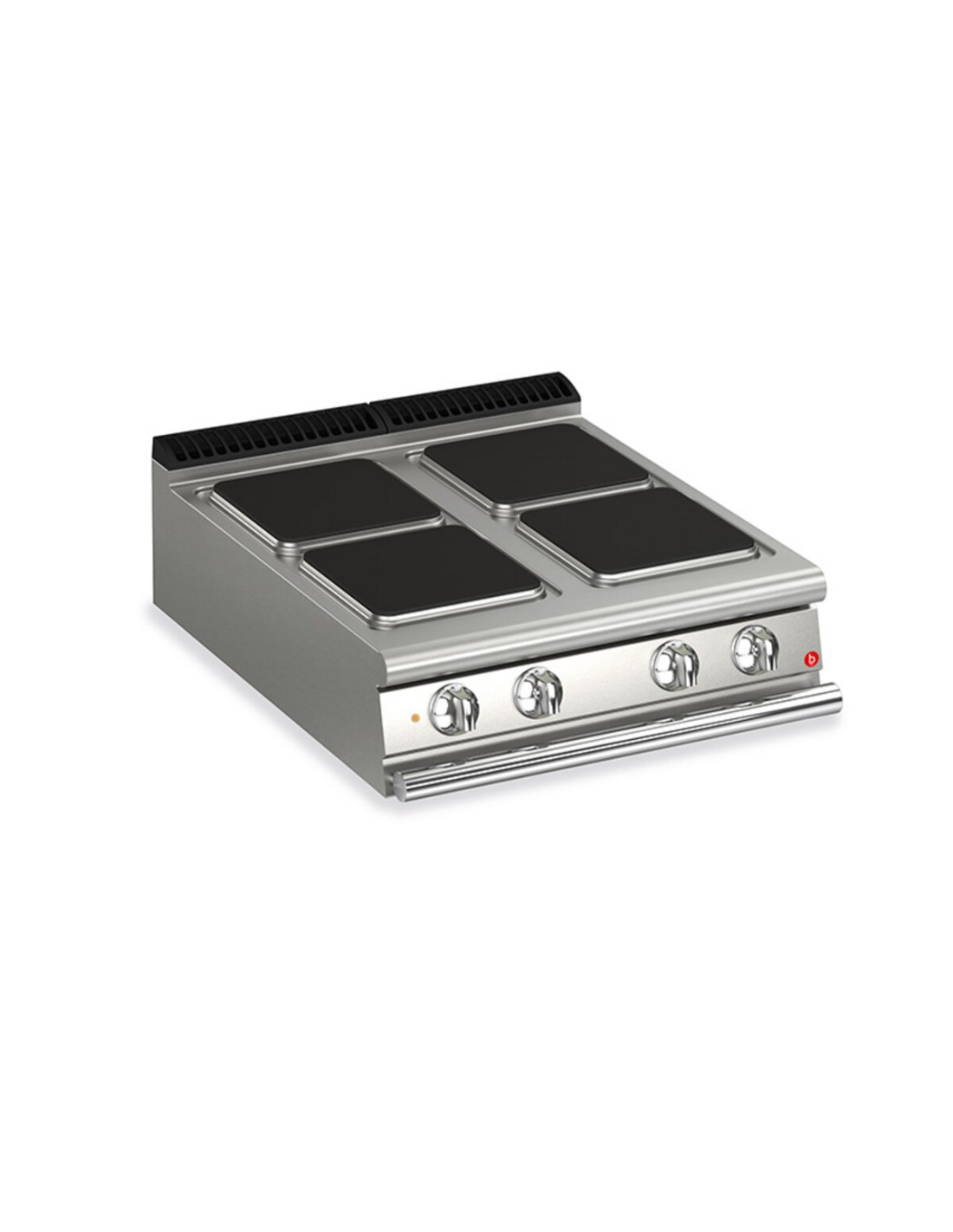 Cocinas eléctricas: placas de fundición de 300x300 mm, potencia máxima 4 kW, termostato de seguridad y selector de 7 posiciones, impermeable a chorros de agua (IPX5), Equipo certificado para directiva de baja tensión 2014/35/UE según esquema CB internacional.Placa totalmente prensada y mecanizada a partir de una sola lámina de acero inoxidable de gran espesor.