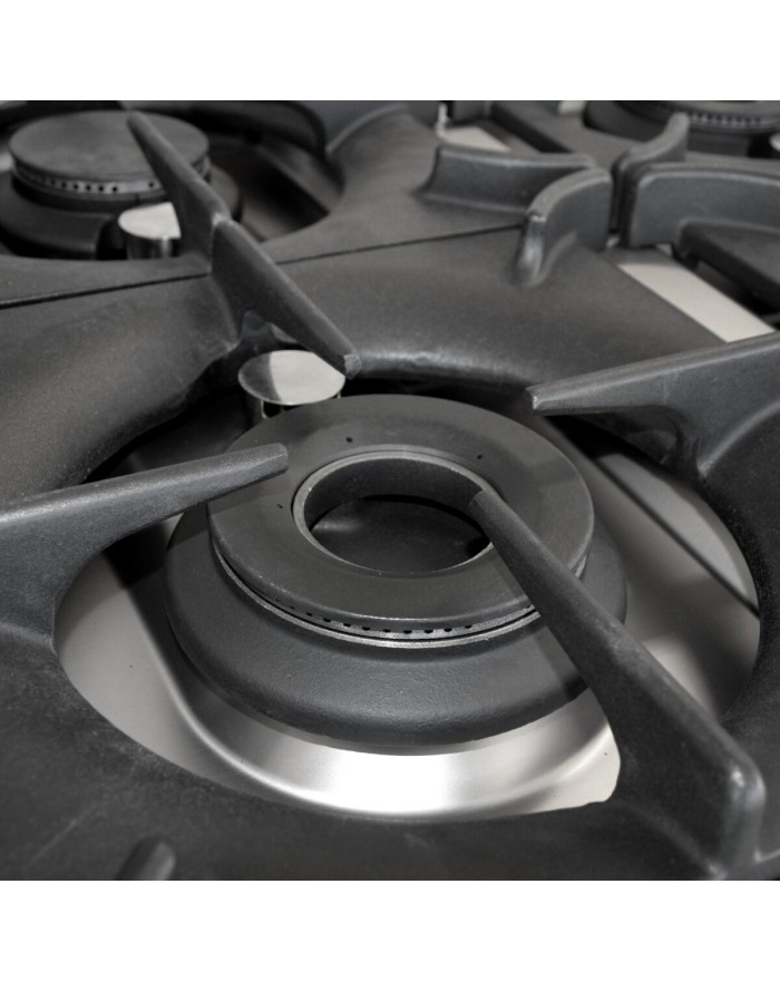 Parrillas de hierro fundido esmaltado con radios largos para facilitar el desplazamiento de las sartenes entre fuegos. Quemadores de hierro fundido de alta potencia 3,5- 5,7- 7 kW. Llama piloto protegida con protección extraíble y fácilmente lavable. Gracias a la certificacion antichorro obtenida mediante pruebas específicas, los pomos y bajopomos pueden lavarse al final de la jornada laboral sin comprometer la funcionalidad ni la seguridad. La barra delantera es un cómodo punto de apoyo para el cocinero; mantiene una distancia de seguridad con la encimera y protege así de colisiones accidentales con lo que está apoyado sobre la encimera y, al mismo tiempo, con los tiradores.