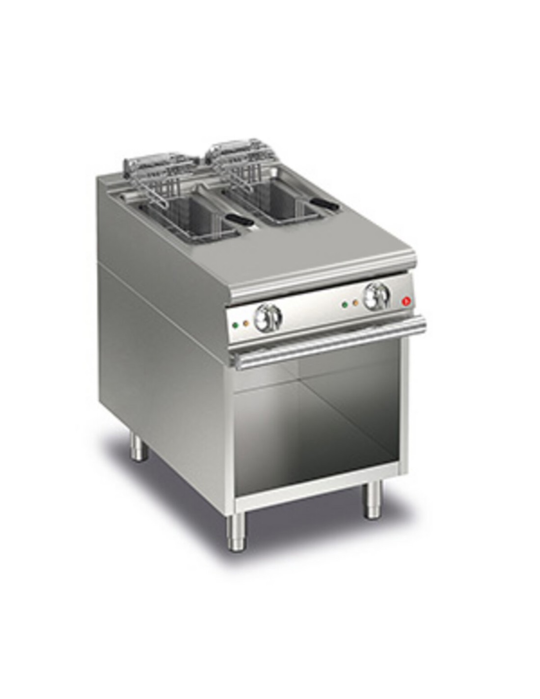 Freidoras eléctricas profesionales. Cubas de acero inoxidable AISI 18/10 con zona fría y zona de expansión de espuma. Grifos de vaciado de aceite. Termostato de seguridad (230°C) contra el sobrecalentamiento excesivo del aceite Versión eléctrica: Calentamiento mediante resistencia blindada de acero inoxidable AISI 304 en el interior de la cuba y giratoria más de 90° en la versión con cuba de 22lt. Resistencia totalmente desmontable en la versión con depósito de 10 y 15 litros.GAS Bandejas de cocción moldeadas de gran capacidad con una amplia zona de expansión vertical que evita la formación de espuma durante la carga. Termostato de regulación automática Termostato de seguridad contra incendios (230°C). Grifos de vaciado de aceite. Soporte para cestas y tapas. Modelos de gas Quemadores tubulares de acero fuera del depósito. Encendido piezoeléctrico del quemador piloto. Modelos eléctricos Elementos calefactores blindados de acero inoxidable, elevables y desmontables. Señal óptica cuando se ha alcanzado la temperatura programada. Luz de advertencia 'equipo bajo tensión. Los depósitos tienen una amplia zona de vertido y una zona fría en el fondo para recoger las partículas de comida y prolongar la vida del aceite. Gracias a la certificacion antichorro obtenida mediante pruebas específicas, los pomos y bajopomos pueden lavarse al final de la jornada laboral sin comprometer la funcionalidad ni la seguridad. La barra delantera es un cómodo punto de apoyo para el cocinero; mantiene una distancia de seguridad con la encimera y protege así de colisiones accidentales con lo que está apoyado sobre la encimera y, al mismo tiempo, con los tiradores.