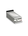 Fry top: placa de cocción de 15 mm de espesor totalmente independiente de la placa de cocción, Gran canal de desagüe a lo largo de todo el perímetro de la placa para la recogida de los residuos de cocción, inclinado hacia la parte delantera para el desagüe de los líquidos en el gran cajón recogegrasas, Placa no soldada para un mantenimiento rápido y una eventual sustitución en uso, Uniformidad térmica, Corte térmico que facilita el trabajo del usuario y de la maquinaria adyacente y reduce el consumo en un 15% en comparación con los modelos tradicionales.