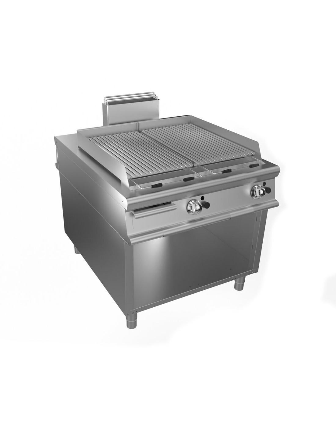 Quemador de acero Aisi 304 controlado por válvula de seguridad y termopar. Encendido piezoeléctrico. Dispositivo de ajuste de la altura de la rejilla en dos niveles. Protectores perimetrales contra salpicaduras (h máx=12mm). Canal con orificio de drenaje y recogida extraíble de grasa y residuos. Cajón interior para recoger los residuos de carbón.