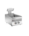 El calienta patatas es adecuado para sostener una cacerola GN 1/1 H. 150 mm, que se mantiene a la temperatura adecuada mediante la combinación de una resistencia inferior y un calentador cerámico por infrarrojos, con interruptores independientes. Temperatura regulable de 30 a 90°C. El falso fondo perforado facilita la extracción del contenido, así como el drenaje del aceite superfluo.