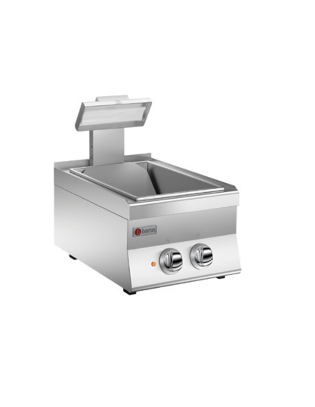 El recipiente eléctrico se calienta mediante un elemento calefactor infrarrojo inferior y otro superior. El depósito es apto para contener cubetas GN, con un falso fondo perforado.