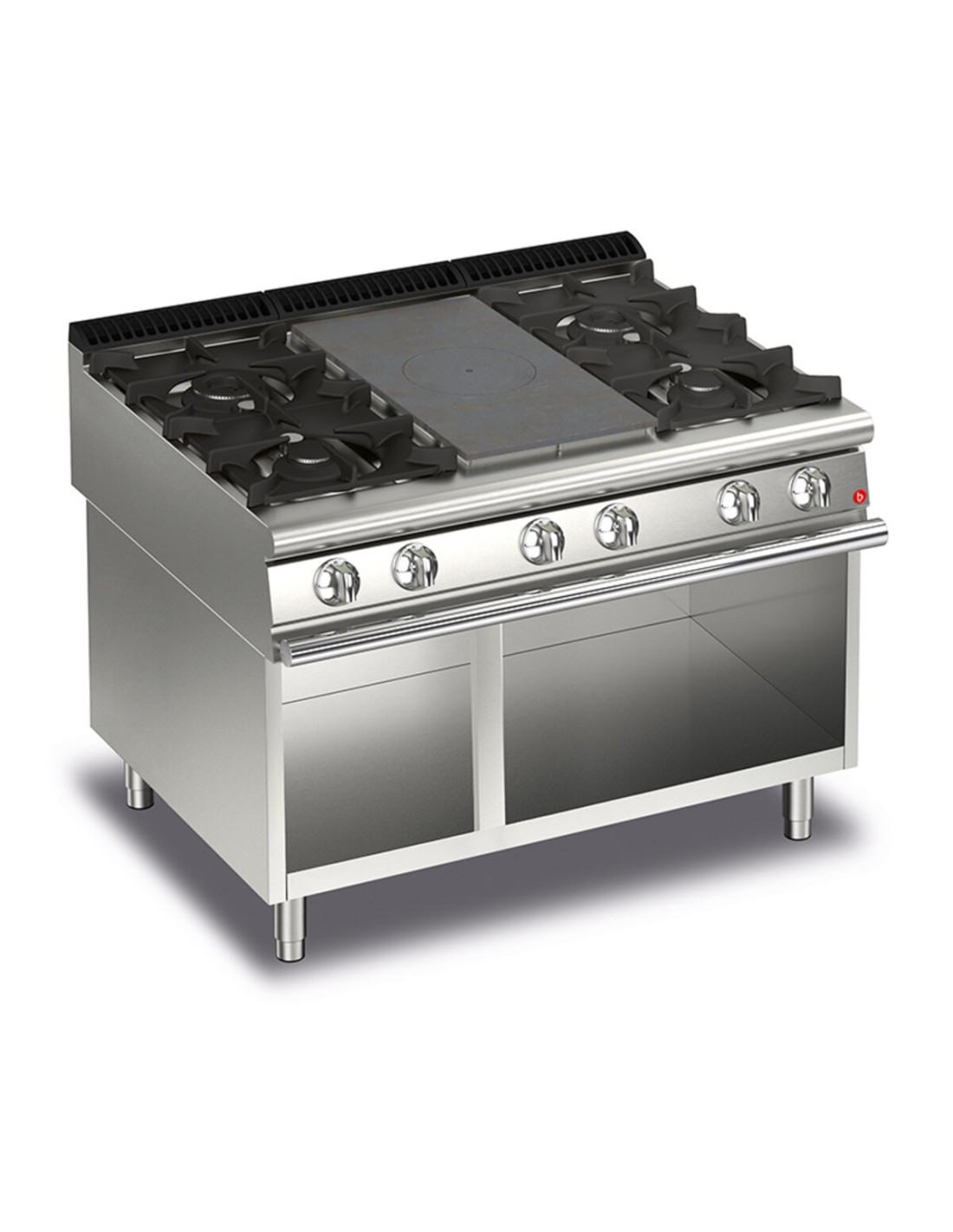 Un único quemador central de alta eficiencia que da lugar a zonas de calor diferenciadas en el suelo, con una concentración de calor máximo en el centro y temperaturas decrecientes en las zonas periféricas. Encimera totalmente moldeada de chapa gruesa de acero inoxidable. Parrillas de hierro fundido esmaltado con radios largos para facilitar el desplazamiento de las sartenes entre fuegos. Quemadores de hierro fundido de alta potencia 3,5- 5,7- 7 y 10 kW. Llama piloto protegida con protección extraíble y fácilmente lavable. Gracias a la certificacion a prueba de chorros (IPX5) obtenida mediante pruebas específicas, los pomos y bajopomos pueden lavarse al final de la jornada laboral sin comprometer la funcionalidad ni la seguridad. La barra delantera es un cómodo punto de apoyo para el cocinero; mantiene una distancia de seguridad con la encimera y protege así de colisiones accidentales con lo que está apoyado sobre la encimera y, al mismo tiempo, con los tiradores.
