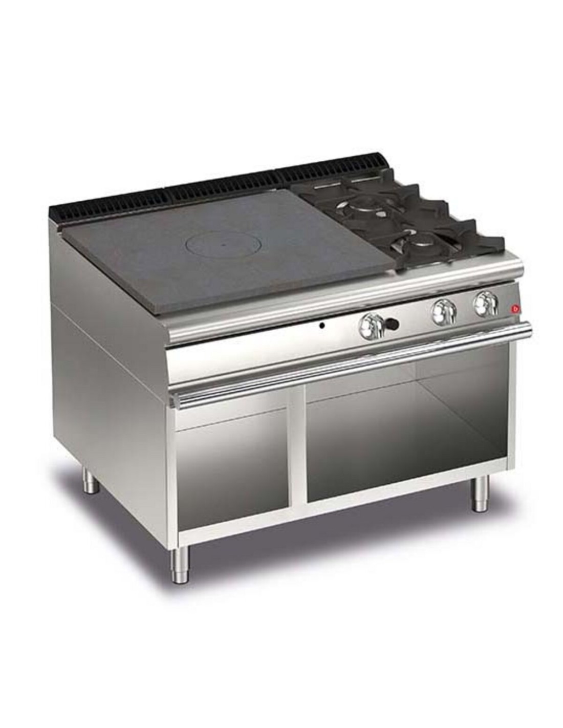 Un único quemador central de alta eficiencia que da lugar a zonas de calor diferenciadas en el suelo, con una concentración de calor máximo en el centro y temperaturas decrecientes en las zonas periféricas. Encimera totalmente moldeada de chapa gruesa de acero inoxidable. Parrillas de hierro fundido esmaltado con radios largos para facilitar el desplazamiento de las sartenes entre fuegos. Quemadores de hierro fundido de alta potencia 3,5- 5,7- 7 kW. Llama piloto protegida con protección extraíble y fácilmente lavable. Gracias a la certificacion antichorro obtenida mediante pruebas específicas, los pomos y bajopomos pueden lavarse al final de la jornada laboral sin comprometer la funcionalidad ni la seguridad. La barra delantera es un cómodo punto de apoyo para el cocinero; mantiene una distancia de seguridad con la encimera y protege así de colisiones accidentales con lo que está apoyado sobre la encimera y, al mismo tiempo, con los tiradores.
