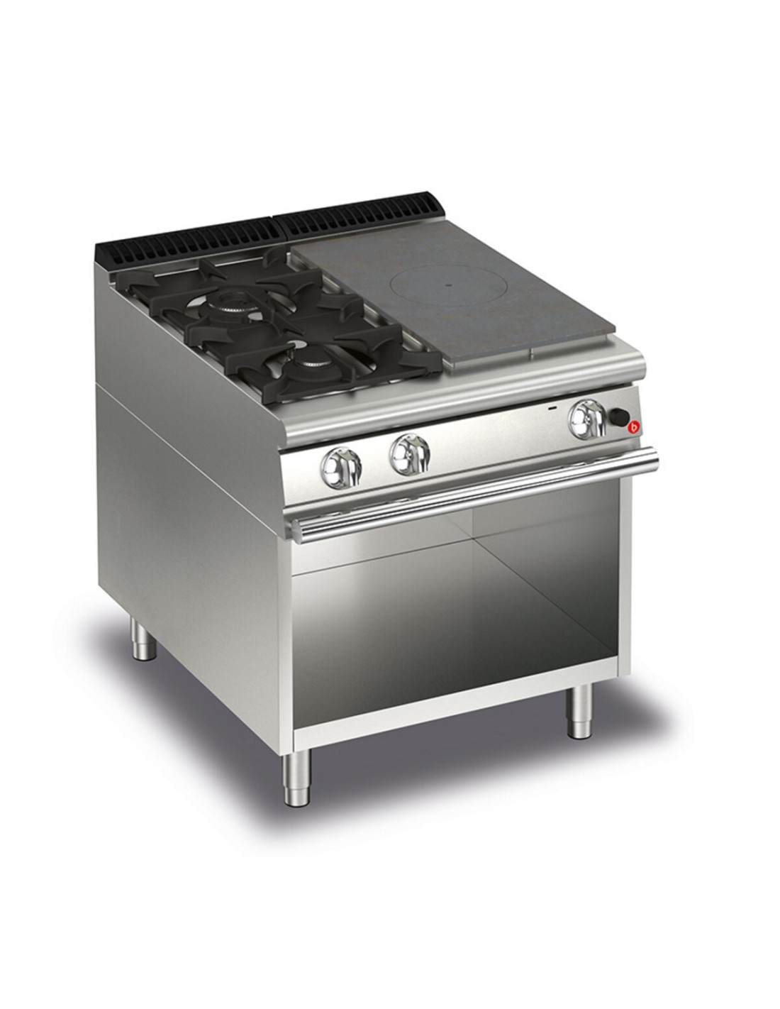 Un único quemador central de alta eficiencia que da lugar a zonas de calor diferenciadas en el suelo, con una concentración de calor máximo en el centro y temperaturas decrecientes en las zonas periféricas. Encimera totalmente moldeada de chapa gruesa de acero inoxidable. Parrillas de hierro fundido esmaltado con radios largos para facilitar el desplazamiento de las sartenes entre fuegos. Quemadores de hierro fundido de alta potencia 3,5- 5,7- 7 kW. Llama piloto protegida con protección extraíble y fácilmente lavable. Gracias a la certificacion antichorro obtenida mediante pruebas específicas, los pomos y bajopomos pueden lavarse al final de la jornada laboral sin comprometer la funcionalidad ni la seguridad. La barra delantera es un cómodo punto de apoyo para el cocinero; mantiene una distancia de seguridad con la encimera y protege así de colisiones accidentales con lo que está apoyado sobre la encimera y, al mismo tiempo, con los tiradores.