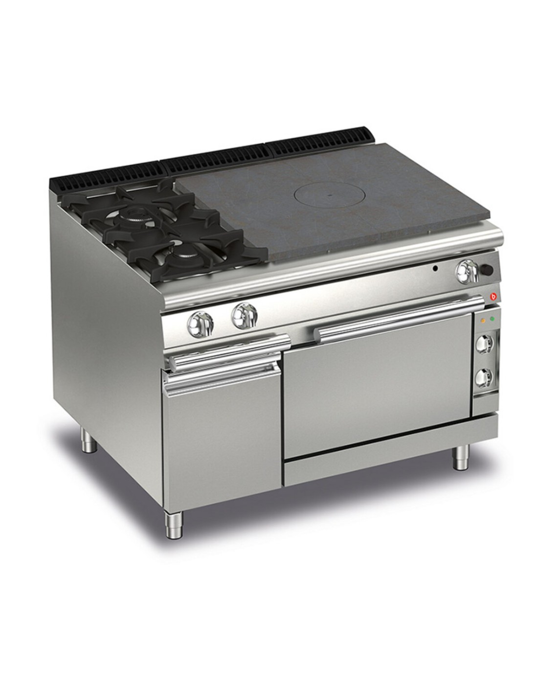 Placa de gas: Placa de hierro fundido con regulación de 50° a 450°C, encendido piezoeléctrico seguro, Quemador central único de alto rendimiento que da como resultado zonas de calor diferenciadas en la placa con una concentración de calor máximo en el centro y temperaturas decrecientes en las zonas periféricas. Placa de hierro fundido pulido con disco central extraíbleGAS Quemador central de alta potencia (12 kW) con encendido piezoeléctrico. Zonas térmicas diferenciadas con temperatura máxima en el centro 500°C, disminuyendo hacia el perímetro. Toma de seguridad con termopar y regulación progresiva de la potencia de salida. Horno - Características generales Cámara de cocción de acero inoxidable (53x70x30cm), aislada térmicamente y equipada con 3 guías antivuelco para recipientes gastronorm 1/1 y 2/1 reducidos. Suela radiante gruesa de hierro fundido para una distribución eficaz del calor. Puerta y contrapuerta de acero inoxidable, perfectamente aisladas y montadas sobre bisagras autoequilibradas. Mango ergonómico, de longitud completa y con aislamiento térmico. Horno de gas Quemador con llama estabilizada alojado bajo la suela. Quemador piloto con encendido piezoeléctrico y manual. Válvula automática con termopar de seguridad de gas. Control termostático de la temperatura de 110 a 330°c. Horno eléctrico Grupos de resistencias de acero inoxidable colocadas en el techo y bajo la suela de la cámara de cocción. Control termostático de la temperatura en la cámara de 100°c a 300°c. Varias posibilidades de conexión. Indicador luminoso de "equipo bajo tensión". Indicador luminoso de que se ha alcanzado la temperatura programada. Un único quemador central de alta eficiencia que da lugar a zonas de calor diferenciadas en el suelo, con una concentración de calor máximo en el centro y temperaturas decrecientes en las zonas periféricas. Encimera totalmente moldeada de chapa gruesa de acero inoxidable. Parrillas de hierro fundido esmaltado con radios largos para facilitar el desplazamiento de las sartenes entre fuegos. Quemadores de hierro fundido de alta potencia 3,5- 5,7- 7 kW. Llama piloto protegida con protección extraíble y fácilmente lavable. Gracias a la certificacion antichorro obtenida mediante pruebas específicas, los pomos y bajopomos pueden lavarse al final de la jornada laboral sin comprometer la funcionalidad ni la seguridad. La barra delantera es un cómodo punto de apoyo para el cocinero; mantiene una distancia de seguridad con la encimera y protege así de colisiones accidentales con lo que está apoyado sobre la encimera y, al mismo tiempo, con los tiradores.