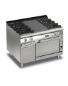 Un único quemador central de alta eficiencia que da lugar a zonas de calor diferenciadas en el suelo, con una concentración de calor máximo en el centro y temperaturas decrecientes en las zonas periféricas. Encimera totalmente moldeada de chapa gruesa de acero inoxidable. Parrillas de hierro fundido esmaltado con radios largos para facilitar el desplazamiento de las sartenes entre fuegos. Quemadores de hierro fundido de alta potencia 3,5- 5,7- 7 kW. Llama piloto protegida con protección extraíble y fácilmente lavable. Gracias a la certificacion antichorro obtenida mediante pruebas específicas, los pomos y bajopomos pueden lavarse al final de la jornada laboral sin comprometer la funcionalidad ni la seguridad. La barra delantera es un cómodo punto de apoyo para el cocinero; mantiene una distancia de seguridad con la encimera y protege así de colisiones accidentales con lo que está apoyado sobre la encimera y, al mismo tiempo, con los tiradores.