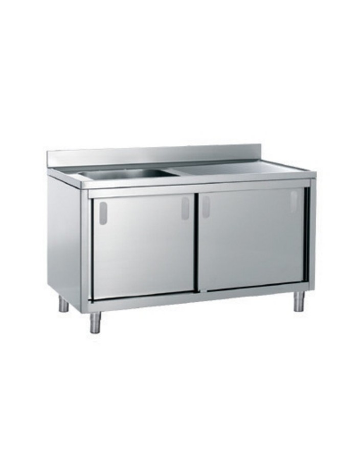ENCIMERA DE ACERO INOXIDABLE 18/10 AISI 304 SB Altura 40 mm Salpicadero 100x15 mm Encastrado con escurridor moldeado, fregaderos soldados al tablero, con agujero de desagüe, colador y rebosadero CARCASAS DE ACERO INOXIDABLE AISI 430 Con respecto al plano de 20 mm por delante, sin espalda, sin estante interior PUERTAS DE ACERO INOXIDABLE AISI 430 Frontal con empuñadura empotrada con contrapuerta interior DESLIZANTES Deslizamiento superior con cojinetes, deslizamiento inferior con solapa de PVC en guías de PVC de doble canal BATIENTES Batiente con imanes y apertura giratoria PIES Cuadro, en tubo 40x40 de acero inoxidable 18/10 AISI 304, con nivelador Ejecución en acero inoxidable Scotch-Brite.Encimera con bandeja moldeada. Contrahuella trasera h 100 mm. Cubeta insonorizada. Puertas insonorizadas batientes o dos correderas. Pies redondos ajustables. Se suministra con tubo de desagüe y rebosadero. Puede equiparse con falso fondo.