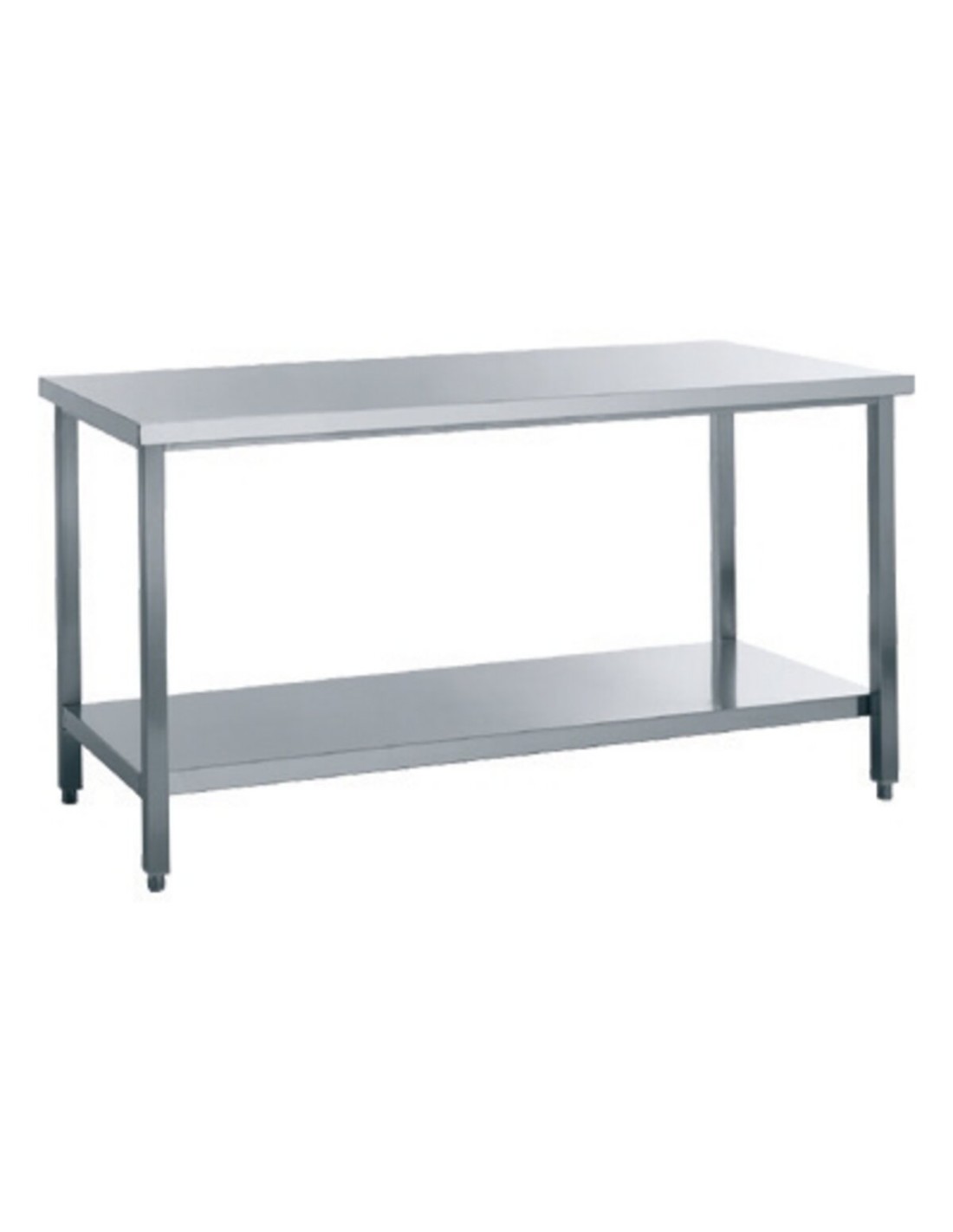 El estante inferior de acero inoxidable AISI 304 cuenta con un refuerzo longitudinal central para mayor resistencia. Instalado a 150 mm del suelo, ofrece practicidad y resistencia ideales.