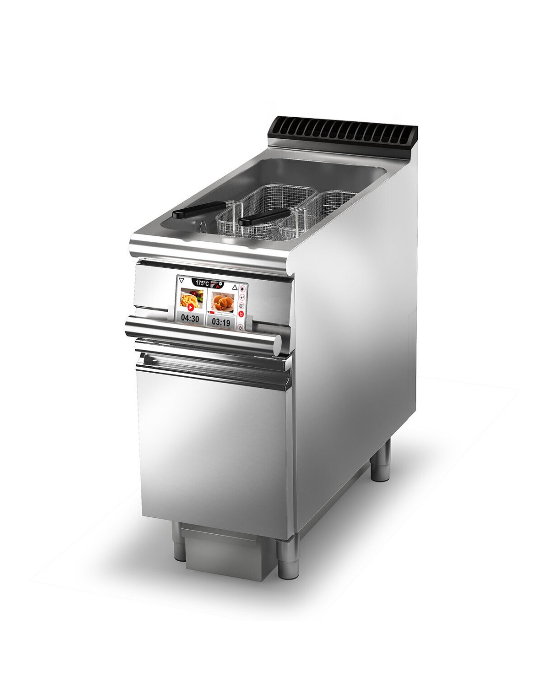 Circulation et filtration de l'huile Levage automatique du panier. En programmant des recettes à partir de l'écran tactile, le panier se lève automatiquement à la fin du temps programmé. Choix automatique parmi une sélection de recettes préétablies et testées qui peuvent être mémorisées par l'utilisateur. Equipement certifié pour la directive basse tension 2014/35/EU selon le schéma CB international. Grâce à la certification de résistance aux jets d'eau (IPX5) obtenue à l'issue de tests spécifiques, les boutons et sous-boutons peuvent être lavés à la fin de la journée de travail sans compromettre la fonctionnalité et la sécurité. La barre frontale est un point d'appui confortable pour le cuisinier ; elle maintient une distance de sécurité par rapport au plan de travail et protège ainsi contre les collisions accidentelles avec ce qui repose sur les plans de travail et en même temps avec les poignees.