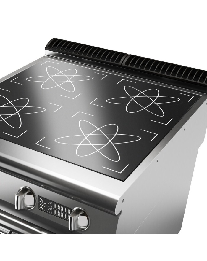 Puissance réglable sur 12 niveaux Composants professionnels testés pour résister à une utilisation intensive dans le temps Capteur de sécurité pour éviter la surchauffe. Zones de cuisson d'une puissance de 5KW Induction à commande mécanique prête pour une connexion IOT à l'informatique en nuage Sérigraphies identifiant les zones de cuisson.