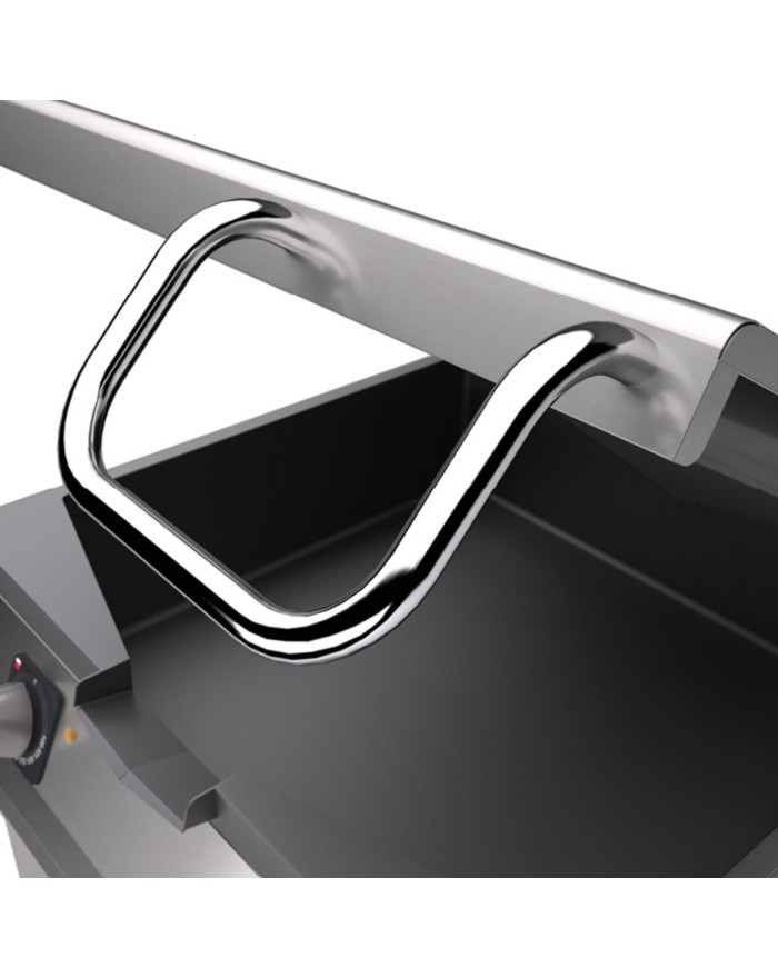 Réservoir basculant à grand rayon. Equipement certifié pour la directive basse tension 2014/35/EU selon le schéma CB international. Grâce à la certification de résistance aux jets d'eau (IPX5) obtenue à l'issue de tests spécifiques, les boutons et sous-boutons peuvent être lavés à la fin de la journée de travail sans compromettre la fonctionnalité et la sécurité. La barre frontale est un point d'appui confortable pour le cuisinier ; elle maintient une distance de sécurité par rapport au plan de travail et protège ainsi contre les collisions accidentelles avec ce qui repose sur les plans de travail et en même temps avec les poignees.