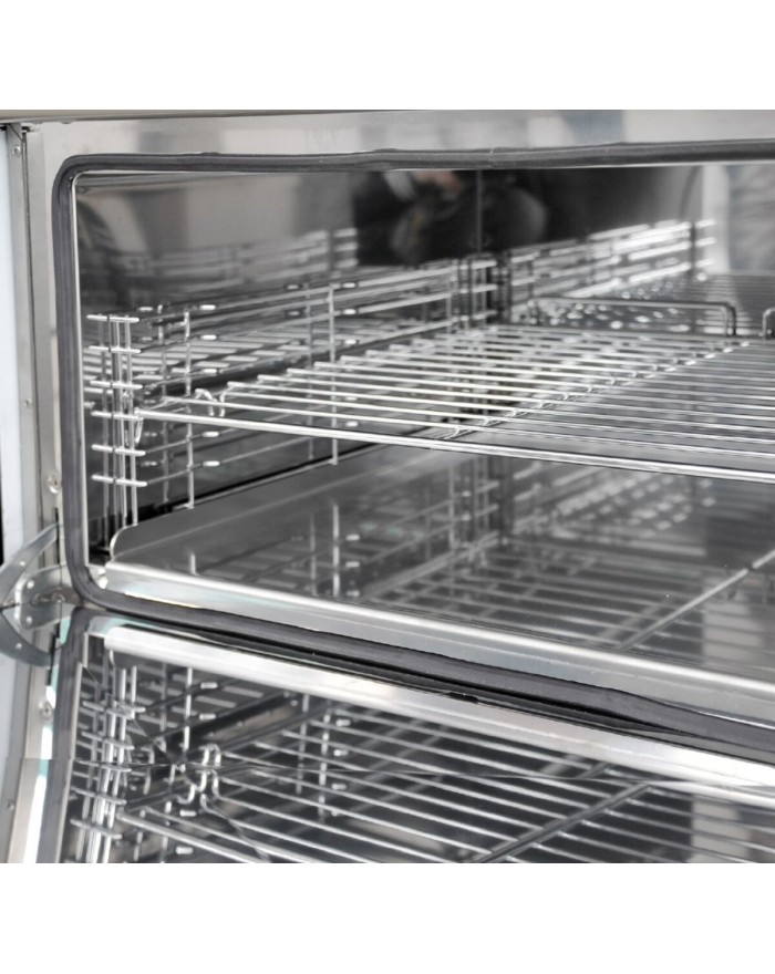 Voyant lumineux pour signaler que l'appareil est sous tension. Les fours GN 1/1 sont disponibles au gaz avec une température réglable de 140 à 280°C, et à l'électricité statique et ventilée avec une température réglable de 110 à 280°C.