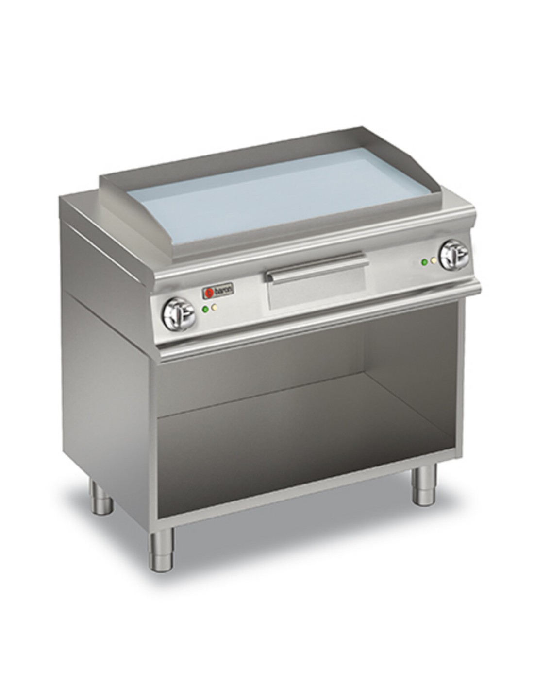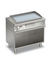 Revêtements extérieurs en acier inoxydable et finition Scotch Brite. Plateaux d'une épaisseur de 2 mm. Des tableaux de bord profilés avec commandes orientées vers l'opérateur. Plaque de cuisson en fer doux (plaque normale), revêtue de chrome dur poli (plaque chromée). Grand tiroir de récupération des graisses. Chauffage au moyen d'éléments chauffants en incoloy blindés. Température de cuisson thermostatée et réglable de 50 à 300°C. Thermostat de sécurité.