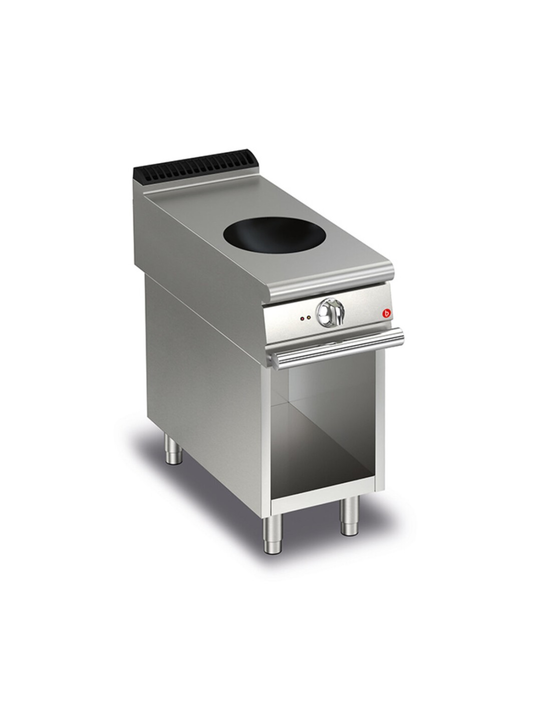 Capteur de sécurité pour éviter la surchauffe. La puissance peut être sélectionnée parmi 10 niveaux différents pour tous les types de cuisson, de la plus rapide à la plus délicate. Grâce à la certification de résistance aux jets d'eau (IPX5) obtenue à l'issue de tests spécifiques, les boutons et sous-boutons peuvent être lavés à la fin de la journée de travail sans compromettre la fonctionnalité et la sécurité. La barre frontale est un point d'appui confortable pour le cuisinier ; elle maintient une distance de sécurité par rapport au plan de travail et protège ainsi contre les collisions accidentelles avec ce qui repose sur les plans de travail et en même temps avec les poignees. Wok électrique avec chauffage par induction 1 zone de cuisson indépendante de 5Kw - diamètre 30cm
