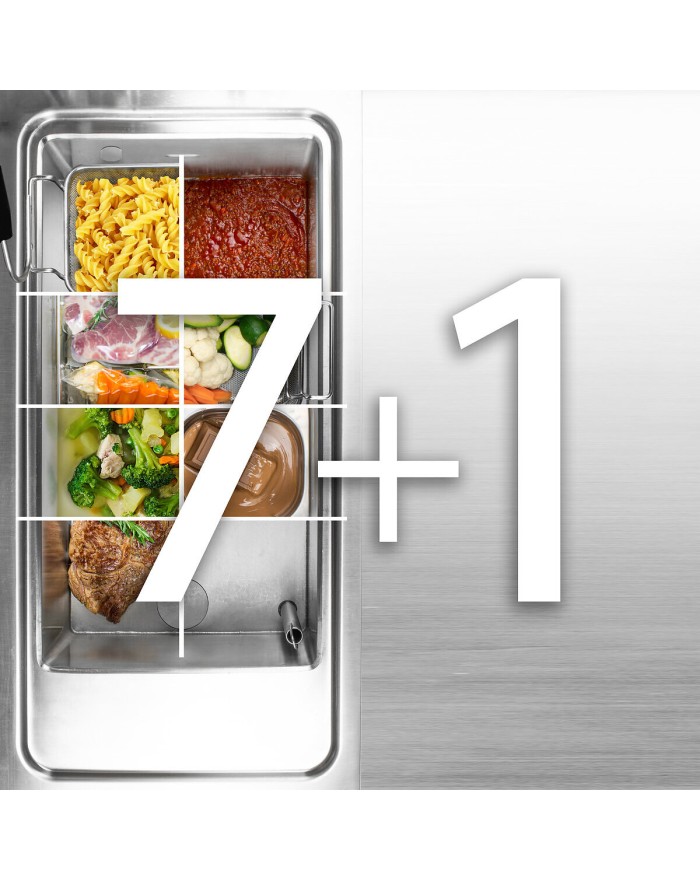 Multifonction TALENT : équipement polyvalent 7+1 fonctions Friteuse / Cuiseur vapeur / Cuiseur de pâtes / Bain-Marie / Bouilloire / Mijotage + programmation personnalisée des recettes étape par étape. Deux zones de cuisson avec températures indépendantes. Contrôle avancé grâce à 3 capteurs, USB pour les recettes, déchargement sécurisé et gestion personnalisée.Utilisation en 7 fonctions : plancha / braisière / cuiseur de pâtes / cuisson lente / cuisson à la vapeur / bouilloire / bain-marie.
